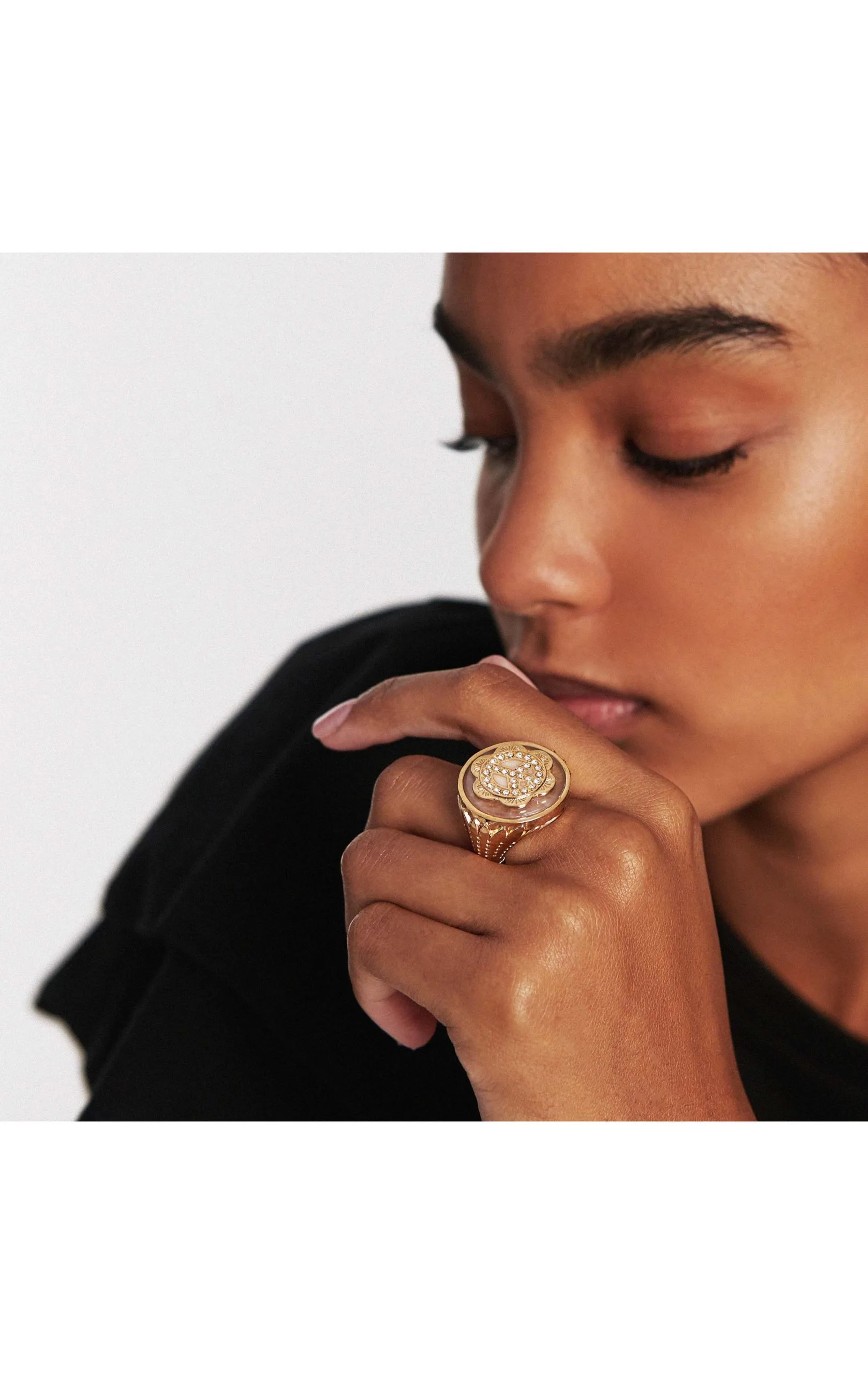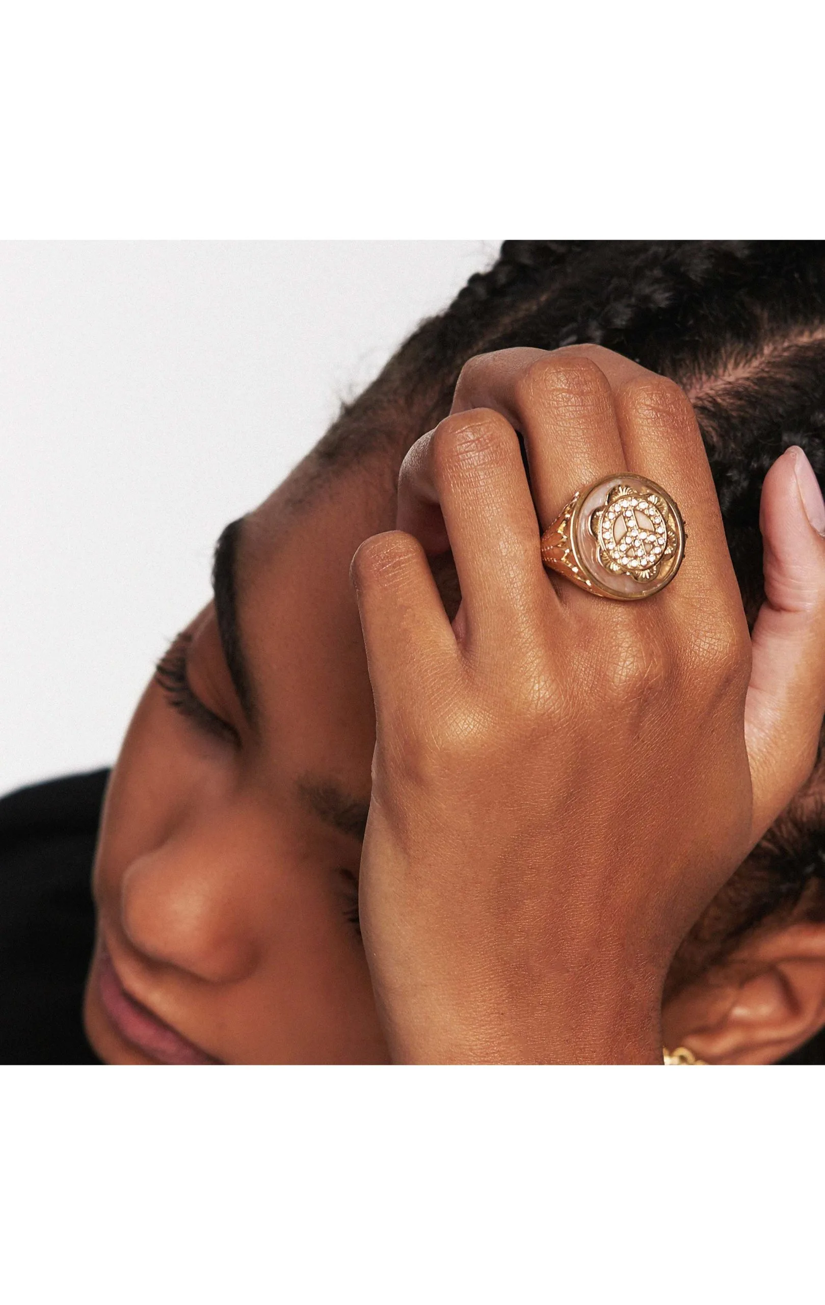 Vous allez craquer pour ce bijou spectaculaire au look très Flower power! Cette bague imposante de forme chevalière ronde est montée sur un corps de bague entièrement sculpté pour former des feuilles de palmiers. Elle est aussi composée d’une pierre naturelle de couleur blanc nude, réhaussée d’un symbole Peace and love entièrement pavé de strass de couleur rouge grenat. Une pièce de caractère pour un look exceptionnel.