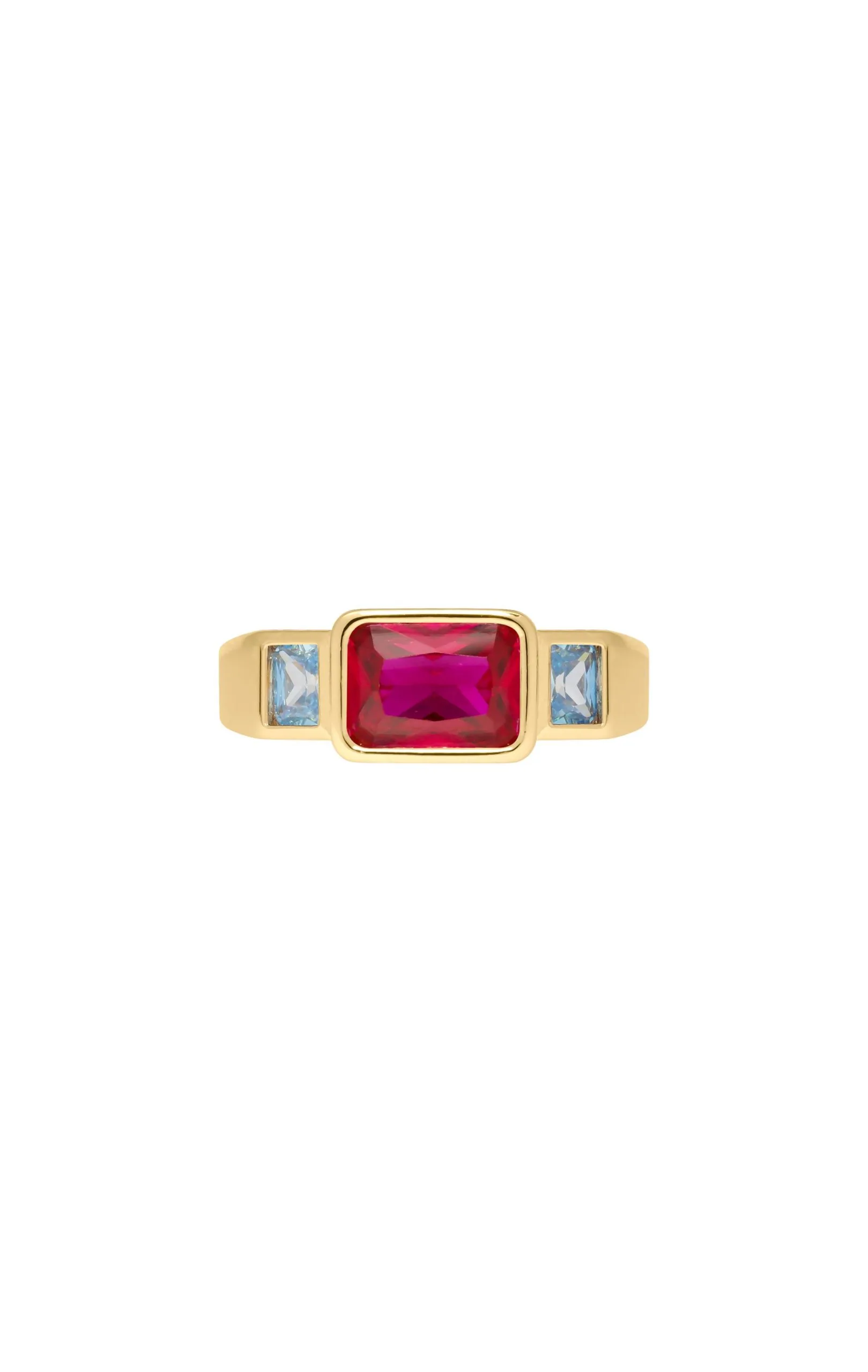On file vers l’exubérance et on craque pour cette bague. Cette bague dorée ornée en son centre d’un strass fuchsia effet rubis, paré de chaque côté de deux strass bleu effet Aigue-marine. La pièce maîtresse pour un style ostentatoire chic, où l’on retrouve la douce folie d’Hipanema.