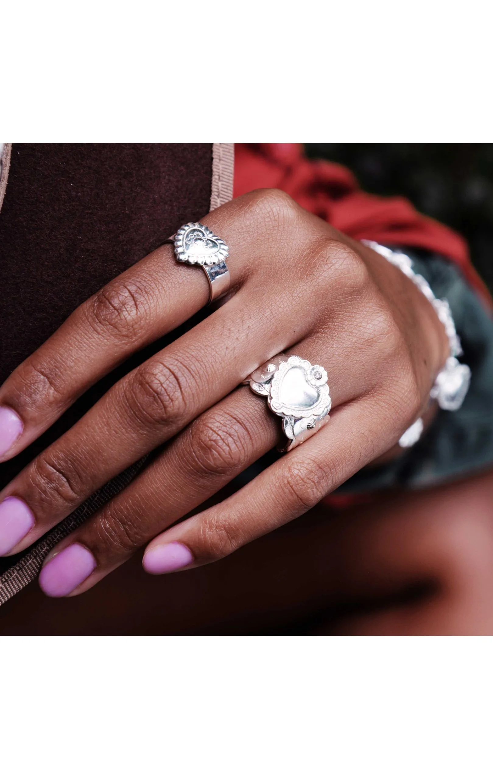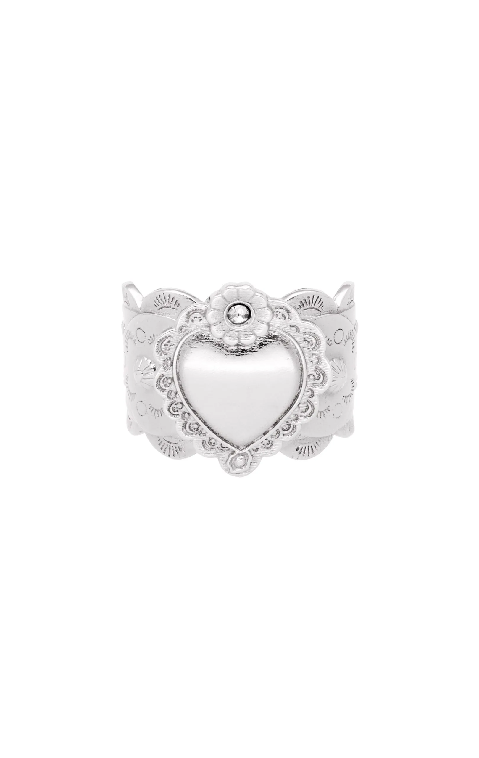 C’est l’indispensable bague, pour plaire au plus grand nombre! Notre bague Chavez très cossue plaquée argent reprend les symboles d’inspiration Nouveau-Mexique, interprétés de manière baroque, tout en ostentation et raffinement. Au centre, on retrouve un cœur ex-voto entouré de deux petites fleurs au cœur strassé effet diamant. Ce bijou entièrement fait à la main présente un corps de bague martelé, découpé en festons, travaillé de façon très ethnique, dans une déclinaison des symboles Navajo sculptés à l’intérieur.