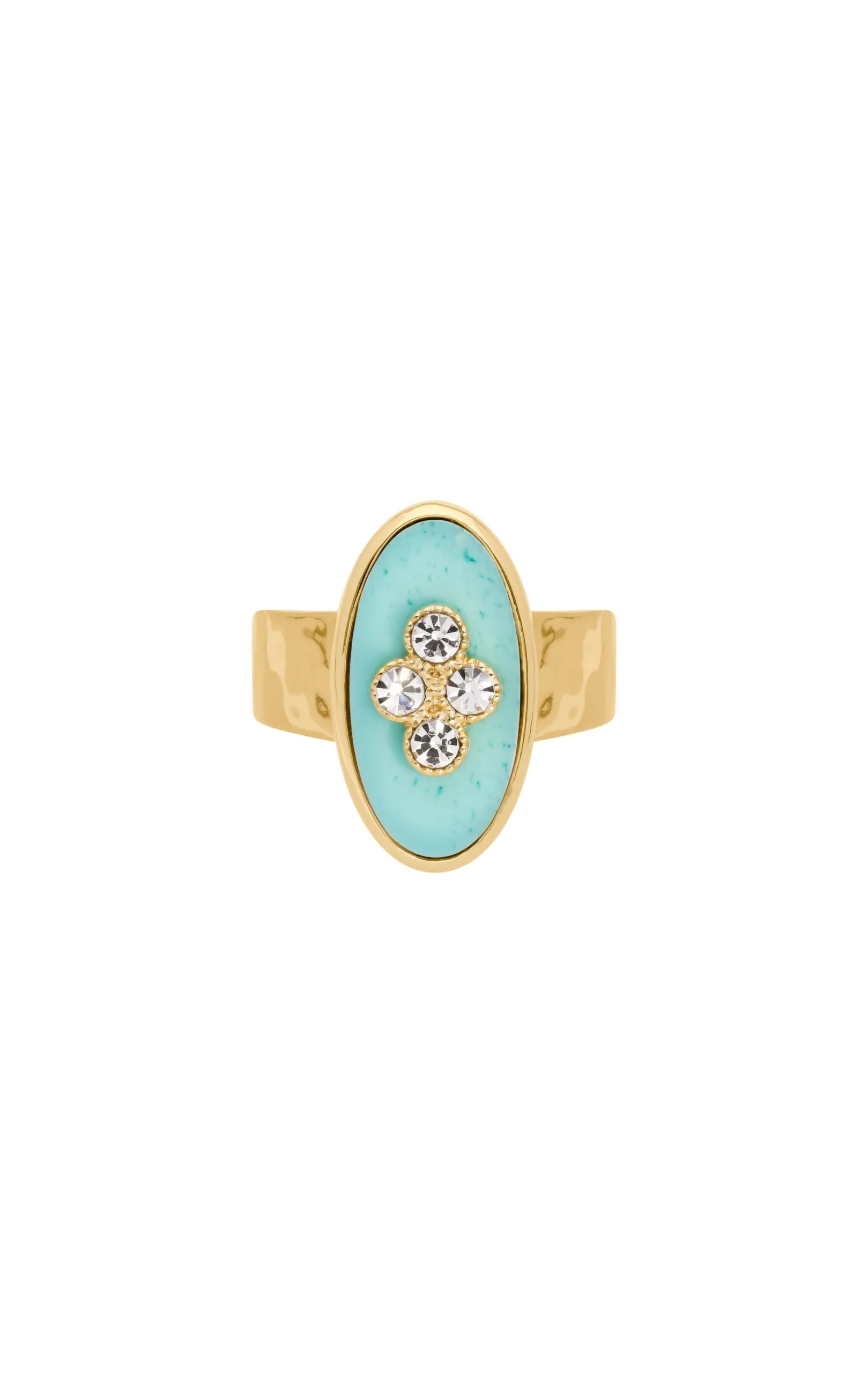 Cette bague dorée à l’or fin 14 carats reprend tous les codes chers à Hipanema. On aime le corps de bague martelé doré, avec en son centre un cabochon oval orné d’une pierre véritable effet turquoise, décorée de quatre petits strass effet diamant. L’alliance de l’ethnique chic, le meilleur de l’artisanat bohème pour ce bijou fait à la main avec amour.