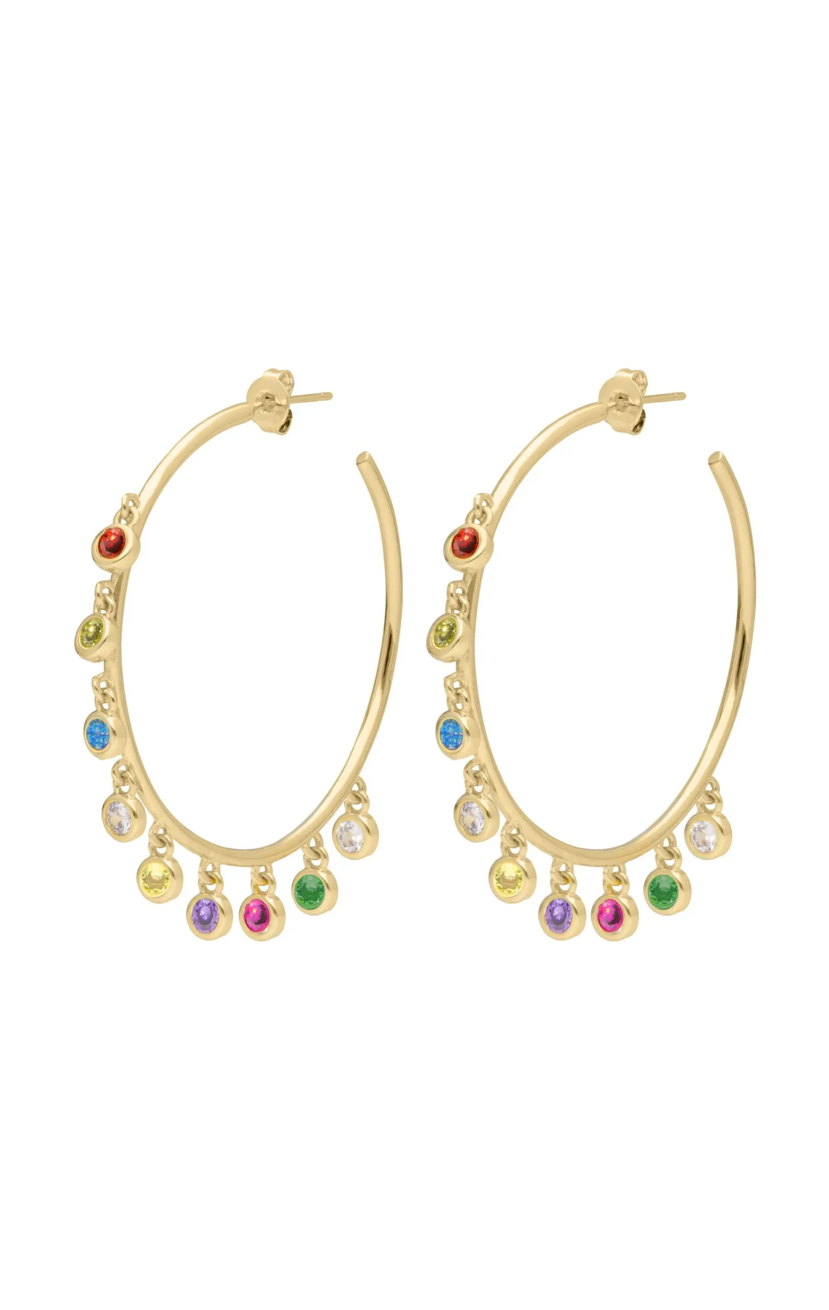 Boucles d’oreilles créoles pour oreilles percées, dorées à l’or fin avec neuf petits ronds en pampilles multicouleurs, effets pierres précieuse: bleu saphir, jaune citrine, rouge rubis, violet quartz, jaune citrine, bleu aigue-marine, vert péridot. Parfaites pour un look bohème et romantique.