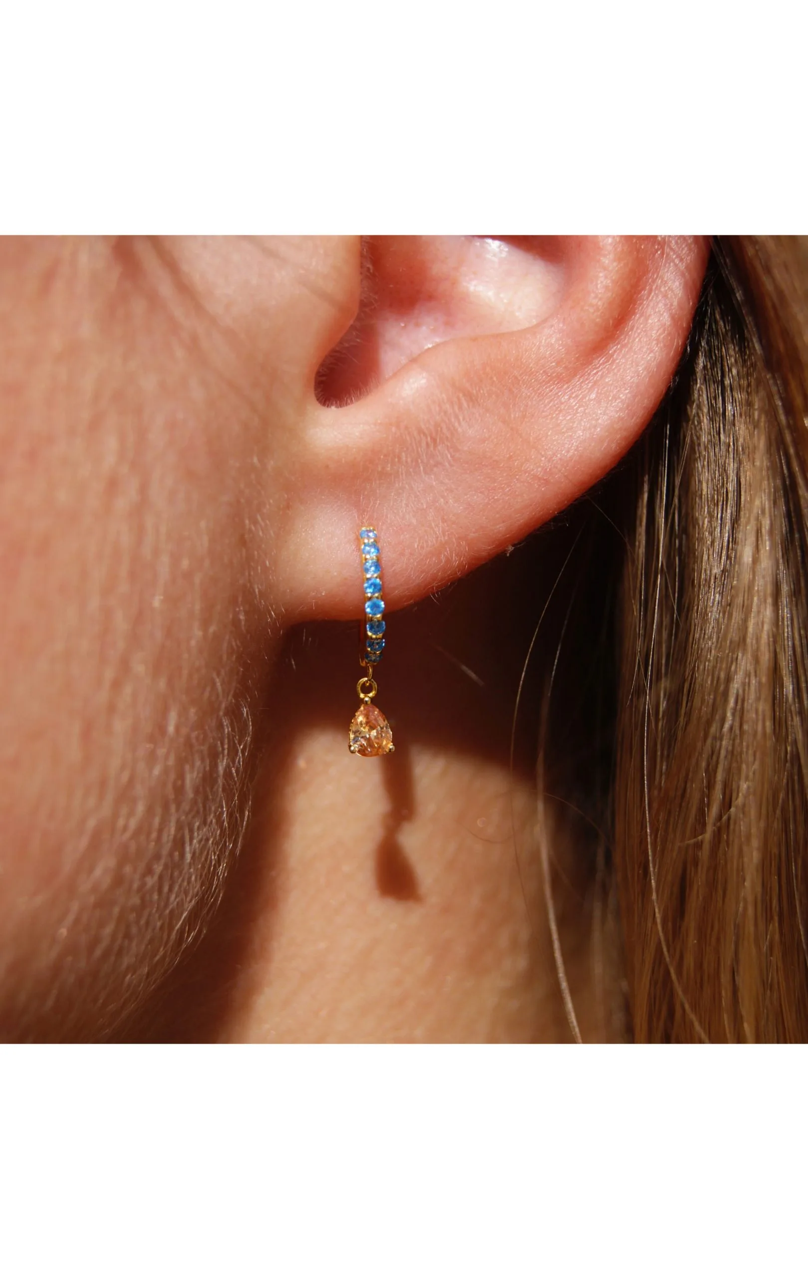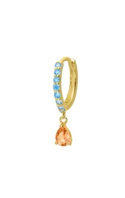 Petites boucles d’oreilles en vermeil, soit argent 925 avec un placage à l’or fin 18 carats. Mini créoles pavées de strass bleu clair effet aigue-marine, avec une goutte en crystal orange clair effet spinelle. Elles peuvent s’acheter en paire ou à l’unité.