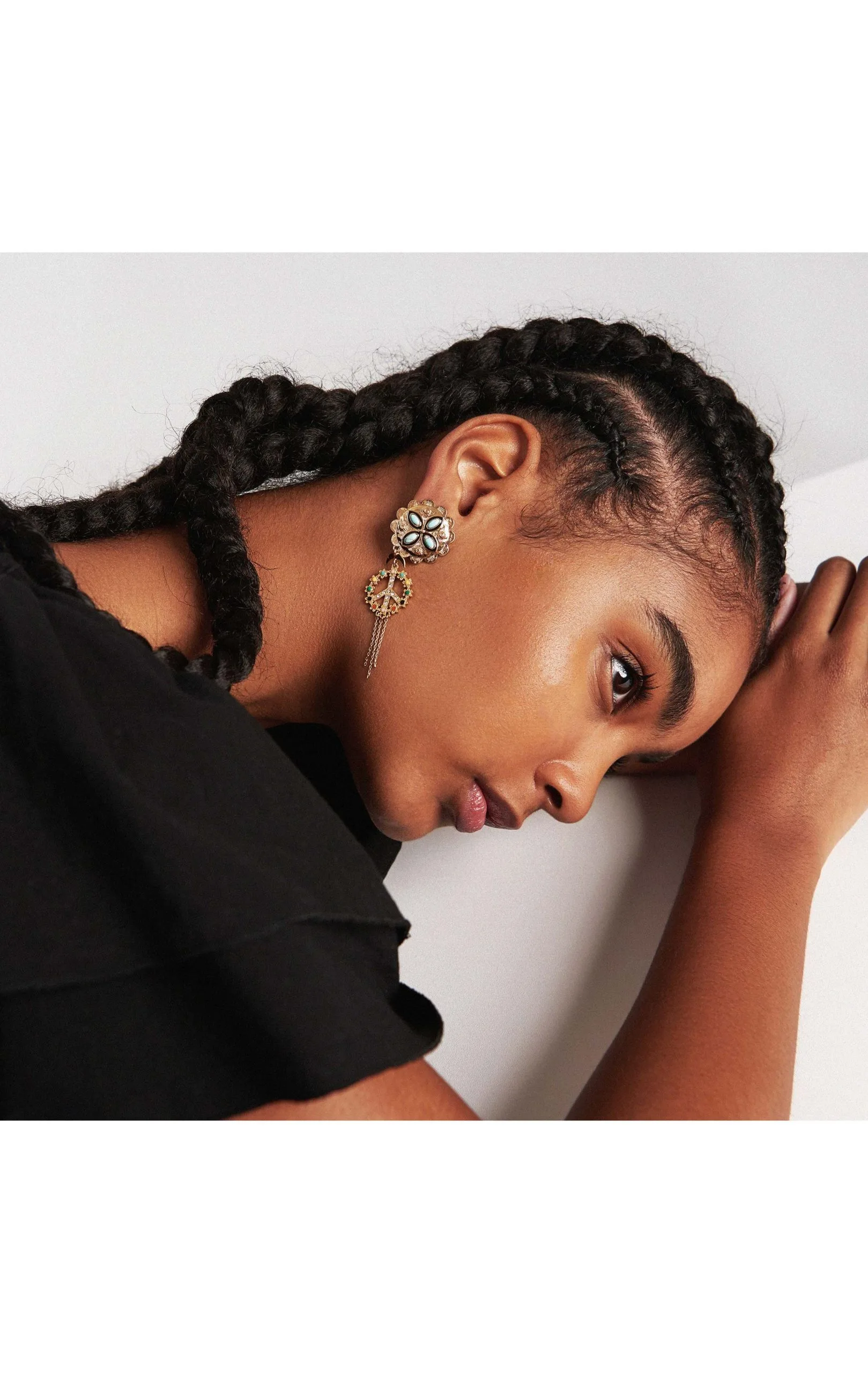 Osez le look retro baroque cet hiver! Ces boucles d’oreilles dorées à l’or fin 14 carats ont la particularité d’être montées sur clip pour oreilles non-percées. Elles sont décorées d’un cabochon solaire décoré d’une fleur noir et turquoise qui rappelle le somptueux travail de la tribu des Zunis. On adore le style Navajo, revisité de manière baroque, qui rend cette collection atypique et féminine.