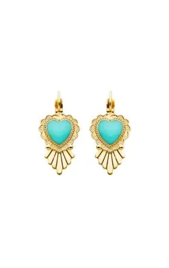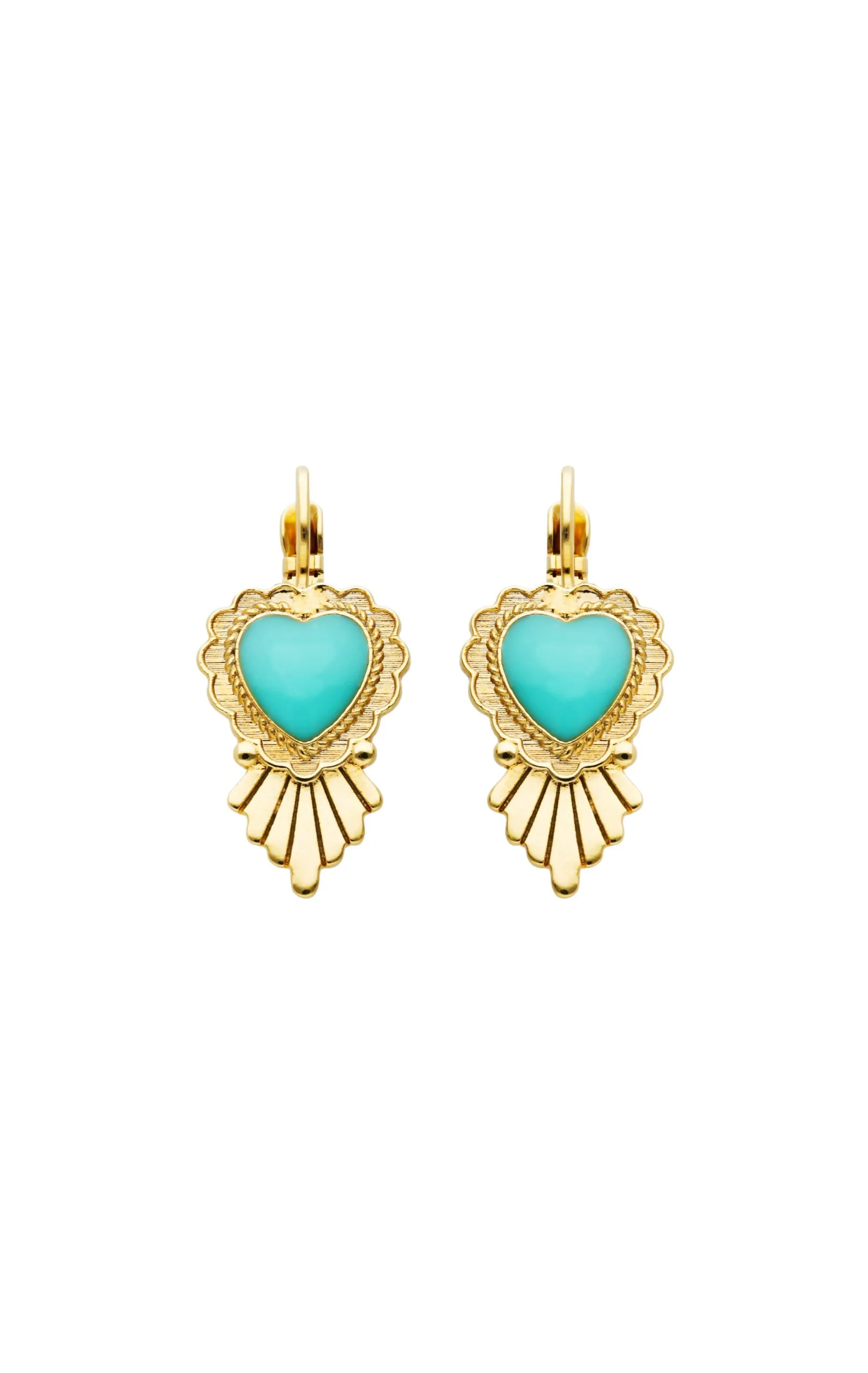 Boucles d’oreilles en laiton doré à l’or fin pour oreilles percées avec une attache dormeuse. Un cœur en résine de couleur turquoise est au centre de cet élégant modèle travaillé de godrons, dans un esprit ex-voto parfait pour déclarer sa flamme. On adore cette inspiration Navajo, Nouveau-Mexique à porter en total-look baroque et bariolé ou pour twister un look plus sage. Ce bijou est fait à la main.