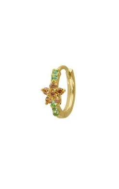 Petites boucles d’oreilles en vermeil, soit argent 925 avec un placage à l’or fin 18 carats. Mini créoles pavées de strass vert effet tsavorite, avec en son centre une petite fleur pavées de crystaux orange effet spinelle. Elles peuvent s’acheter en paire ou à l’unité.