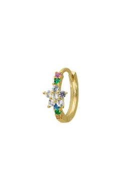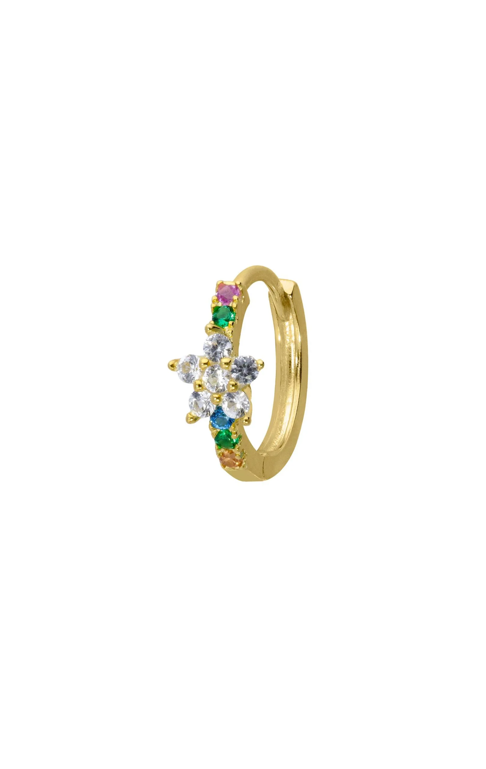 Petites boucles d’oreilles en vermeil, soit argent 925 avec un placage à l’or fin 18 carats. Mini créoles pavées de strass multicolores, avec en son centre une petite fleur pavées de crystaux effet diamant. Elles peuvent s’acheter en paire ou à l’unité.