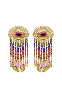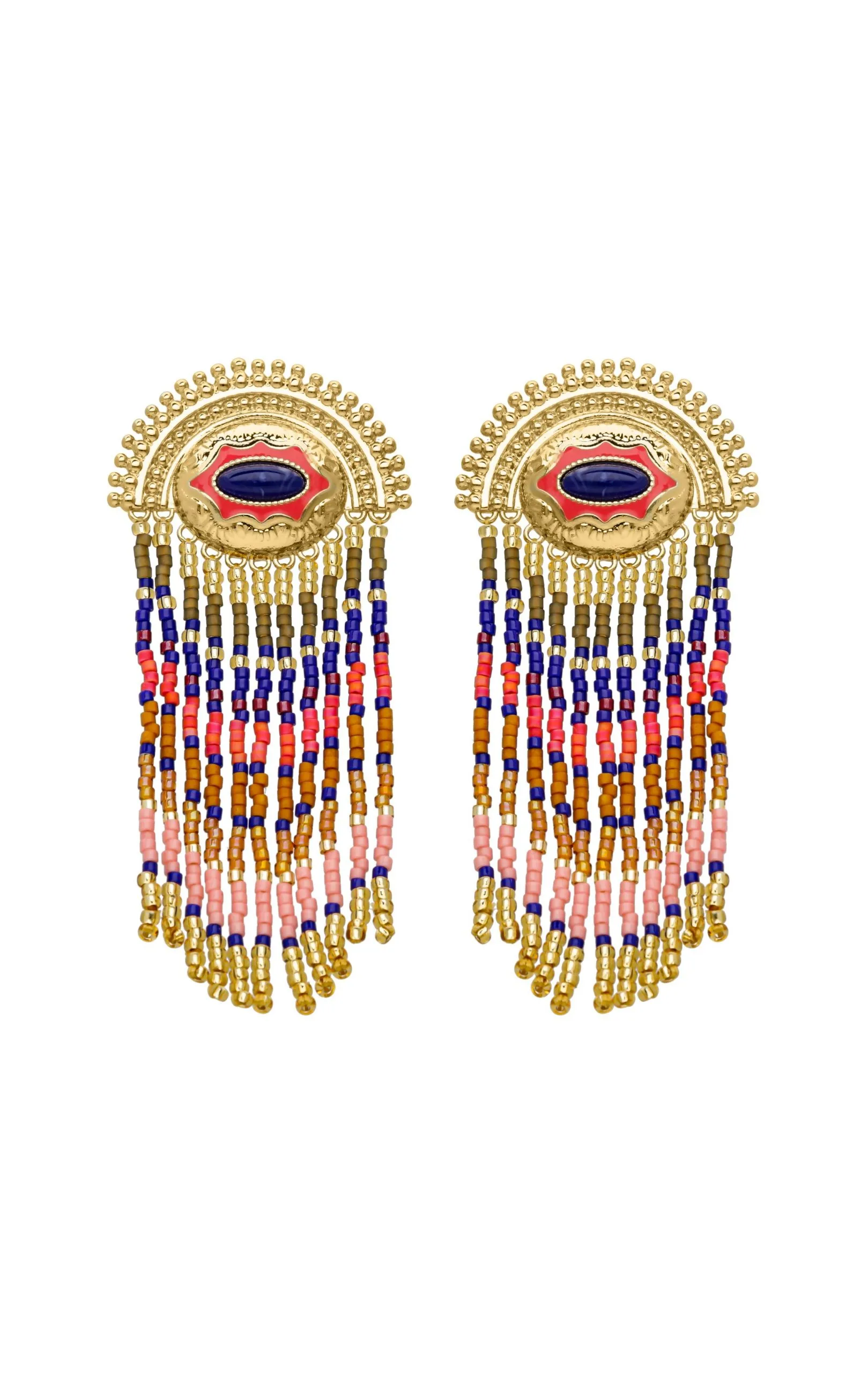 À vous les divinités Mayas! Boucles d’oreilles dorées à l’or fin, conviennent aux oreilles non percées avec leur fermoir clip. On retrouve une tête de boucle exceptionnelle qui reprend les codes mayas, avec une couronne ouvragée. Le cabochon est travaillé avec de l’émail rouge sur une pierre bleue en sodalite, et surplombe une cascade frangée de onze liens en perles, dans des couleurs de bleu, caramel, orange, rose pastel, doré. Une paire de boucles d’oreilles XXL pour faire de vous une reine en toutes occasions! Ce bijou est fait à la main.