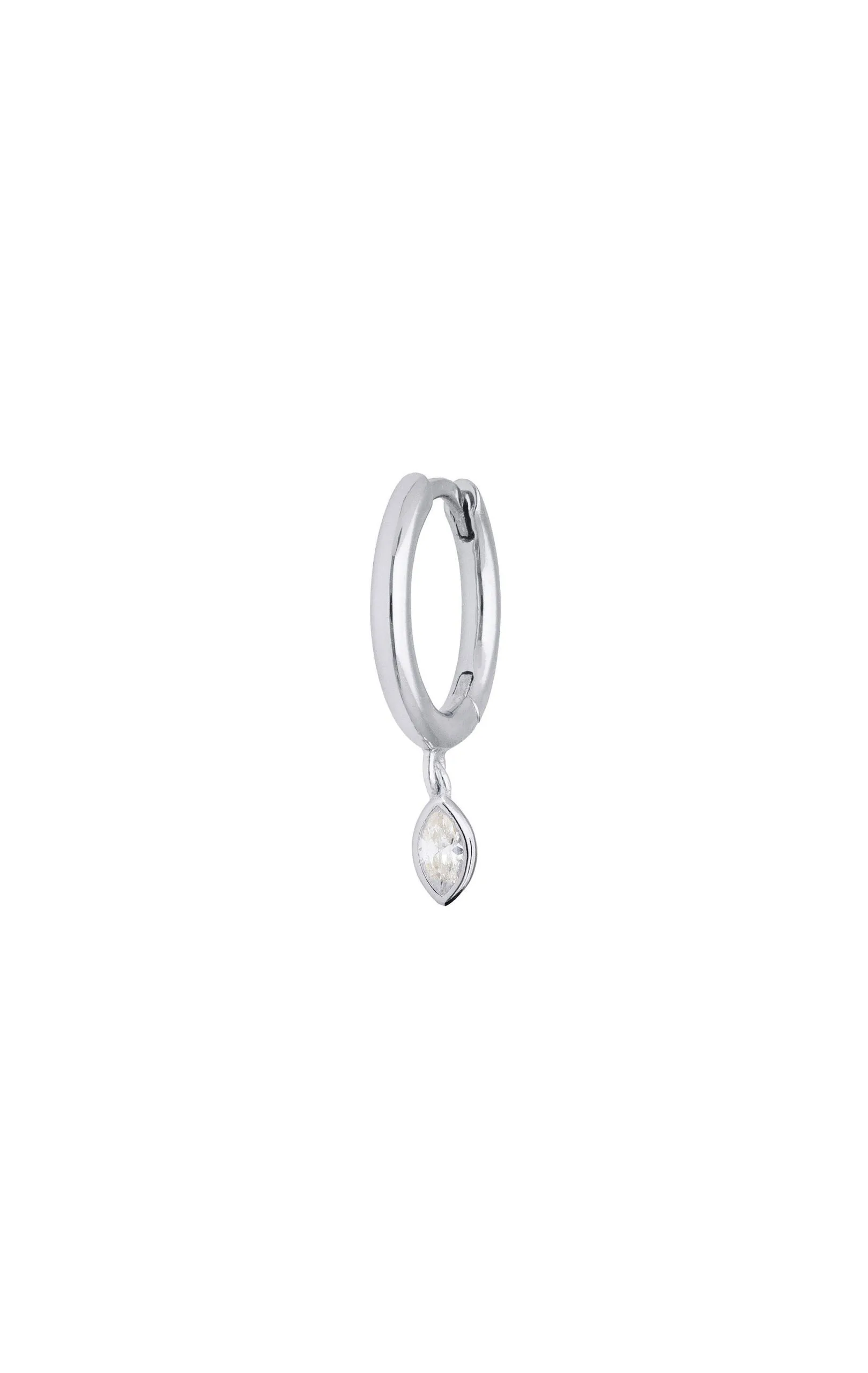 Mini créoles dites “hoops” en argent 925, ornées d’une pampille marquise en cristal effet diamant. Elles peuvent s’acheter en paire ou à l’unité.