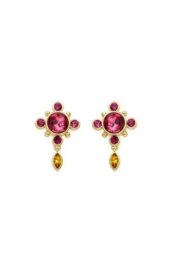 Boucles d’oreilles dorées à l’or fin 14 carats, avec une tige pour oreilles percées. L’élément central est composé d’un strass cossu effet rubis et entouré de quatre petits strass assortis. Un pendentif goutte jaune effet citrine ajoute une touche de fantaisie à sa composition. Vestiaire très estival et festival, à assortir, à accumuler, pour des boucles d’oreilles à porter seules ou accompagnées. Ce bijou est fait à la main.