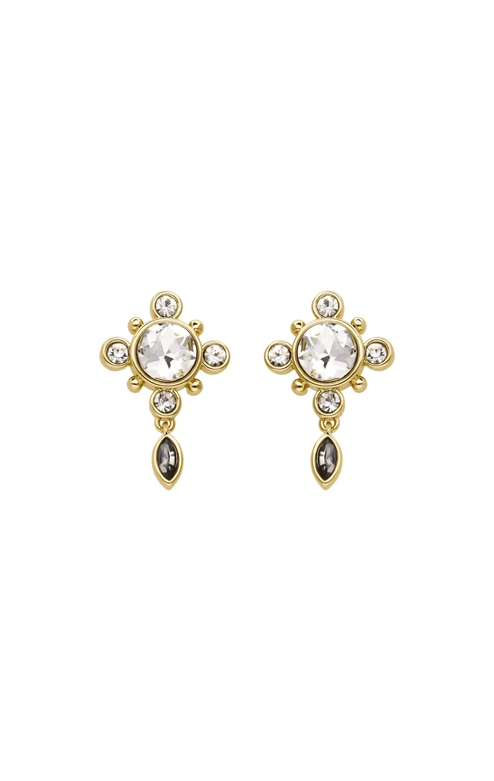 Boucles d’oreilles dorées à l’or fin 14 carats, avec une tige pour oreilles percées. L’élément central est composé d’un strass cossu effet diamant et entouré de quatre petits strass assortis. Un pendentif goutte smocky ajoute une touche de fantaisie à sa composition. Vestiaire très estival et festival, à assortir, à accumuler, pour des boucles d’oreilles à porter seules ou accompagnées. Ce bijou est fait à la main.