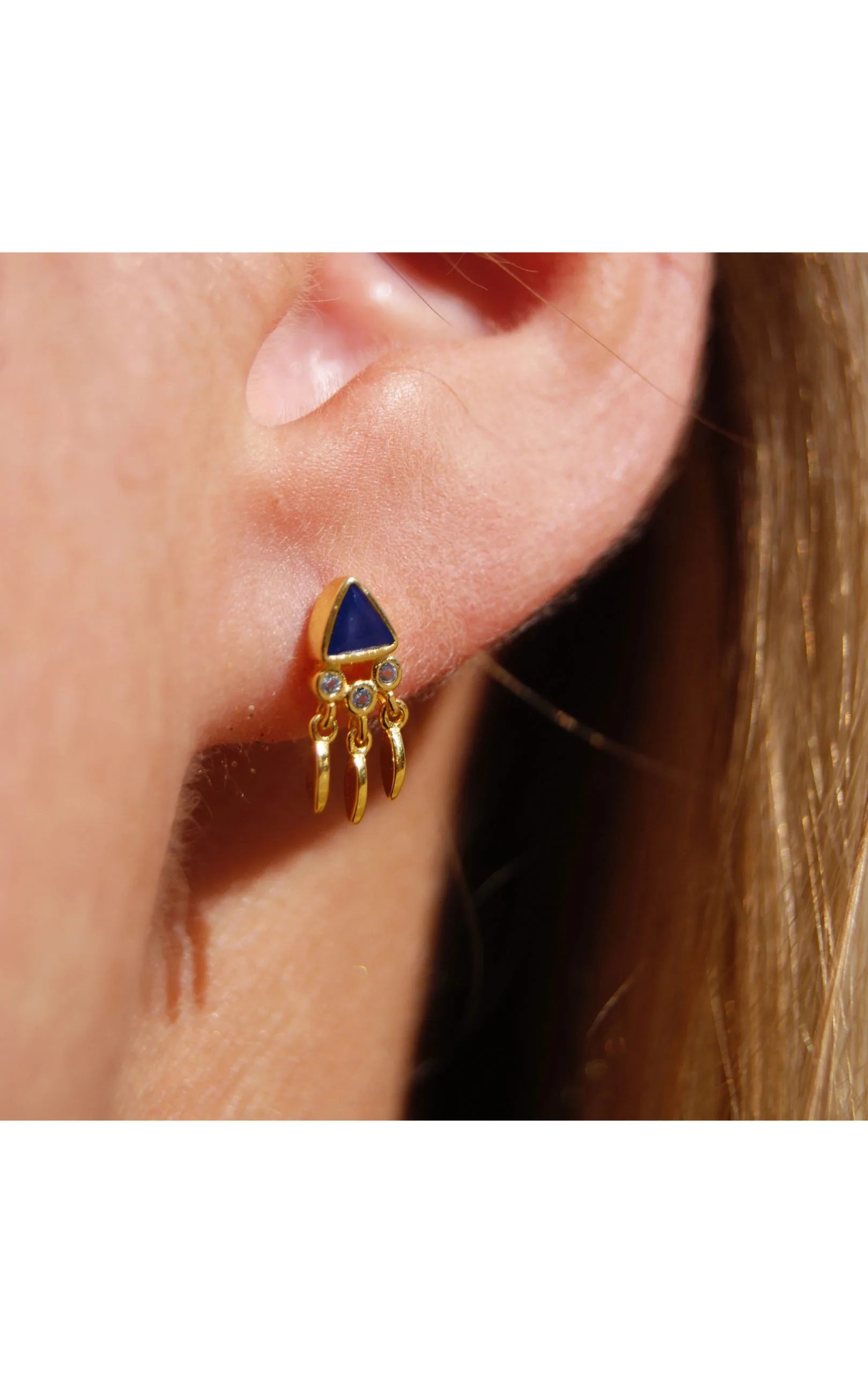 Petites boucles d’oreilles en vermeil, soit argent 925 avec un placage à l’or fin 18 carats. Puces d’oreilles totem avec en tête une pyramide en crystal bleu effet saphire et trois crystaux bleu clair effet aigue-marine en dessous, suivis de pampilles articulées dorées. Elles peuvent s’acheter en paire ou à l’unité.