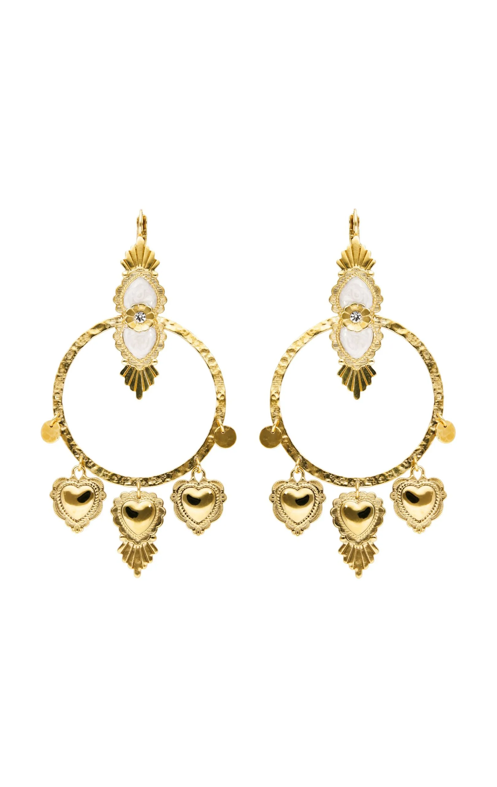 Boucles d’oreilles créoles pour oreilles percées dorées à l’or fin, munies d’une attache dormeuse. La tête de boucle est composée de deux cœurs inversés en résine nacrée, martelés, travaillés de style baroque sur un anneau créole orné de pampilles breloques dorées: des petits cœurs et sequins d’inspiration Amérique Latine. On craque pour cette association de couleurs entre nacre et effet or dans un esprit Nouveau-Mexique. Ce bijou est fait à la main.