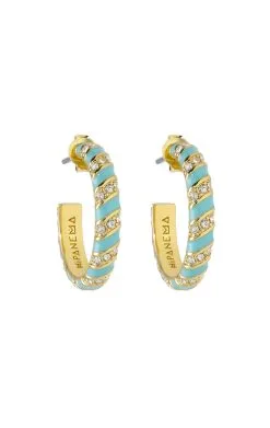Cet hiver, vous allez succomber pour ces petits bonbons colorés et adorerez les accumuler selon votre humeur! Ces petites créoles dorées à l’or fin 14 carats sont entièrement pavées de strass effet diamant combinés en torsade avec de l’émail turquoise. On est fan de leur look classique chic que l’on peut twister facilement en les associant aux autres couleurs. Une pièce immanquable pour cette saison.