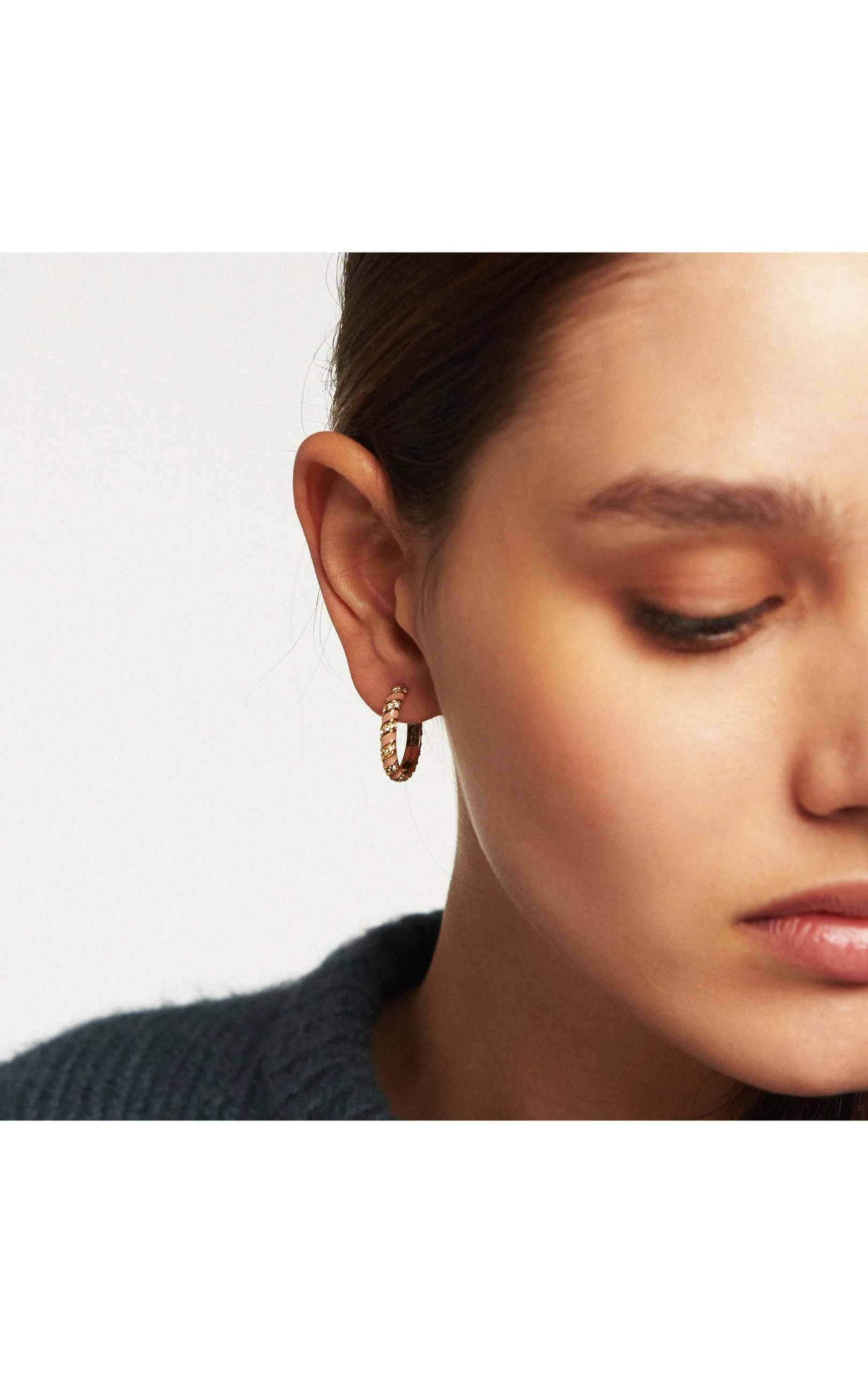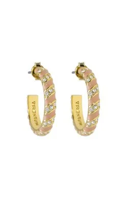 Cet hiver, vous allez succomber pour ces petits bonbons colorés et adorerez les accumuler selon votre humeur! Ces petites créoles dorées à l’or fin 14 carats sont entièrement pavées de strass effet diamant combinés en torsade avec de l’émail beige nude. On est fan de leur look classique chic que l’on peut twister facilement en les associant aux autres couleurs. Une pièce immanquable pour cette saison.
