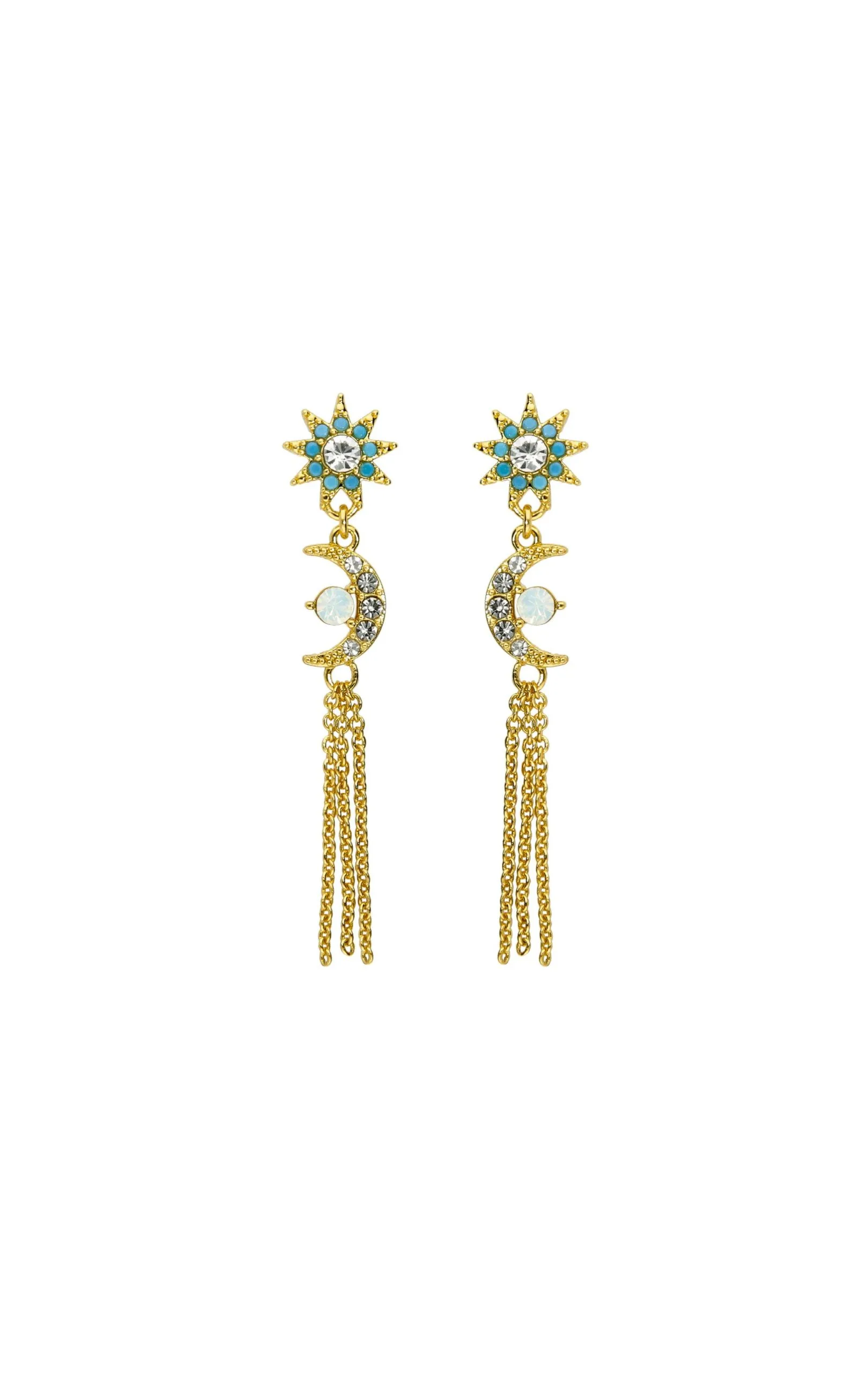 Cette saison, jouez l’élégance sans faille! Ces petites boucles d’oreilles dorées à l’or fin 14 carats sont aussi chic que raffinées. Elles sont composées en totem: d’une tête de boucle en forme d’étoile pavée de strass turquoise, d’un strass effet diamant en son centre, d’une petite lune pavée de strass effet diamant et d’un strass effet pierre de lune en son centre, ainsi que d’un pompon en chaîne. Une petite pièce parfaite pour un look féminin et discret.