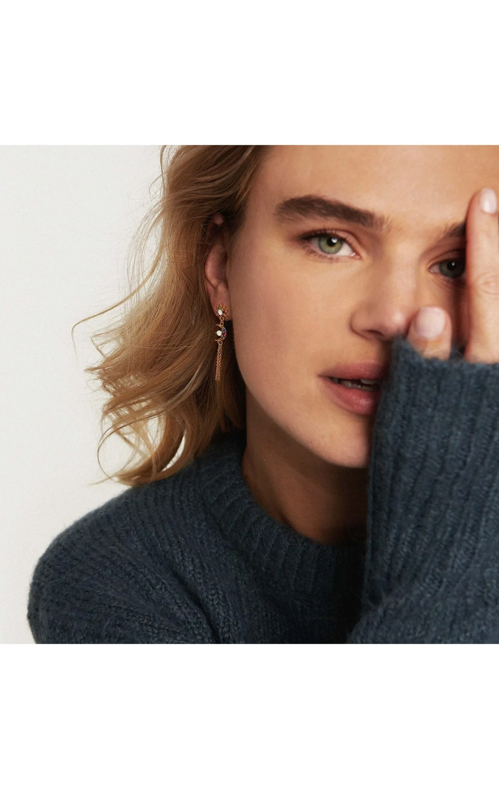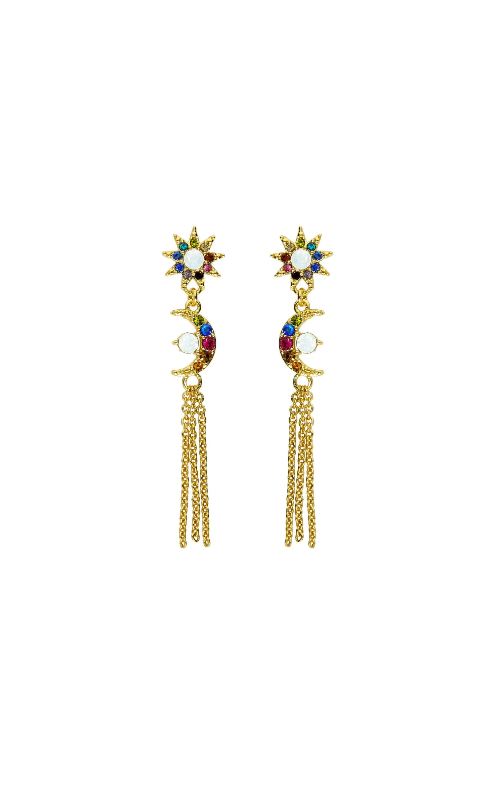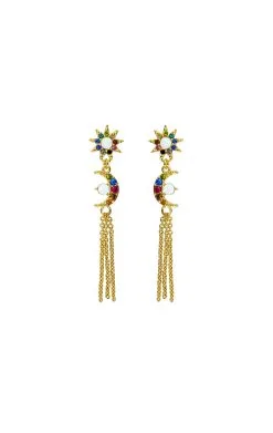Cette saison, jouez l’élégance sans faille! Ces petites boucles d’oreilles dorées à l’or fin 14 carats sont aussi chic que raffinées. Elles sont composées en totem: d’une tête de boucle en forme d’étoile pavée de strass multicolores effet arc-en-ciel, d’un strass effet pierre de lune en son centre, d’une petite lune pavée de strass multicolores et d’un strass pierre de lune en son centre, ainsi que d’un pompon en chaîne. Une petite pièce parfaite pour un look féminin et discret.