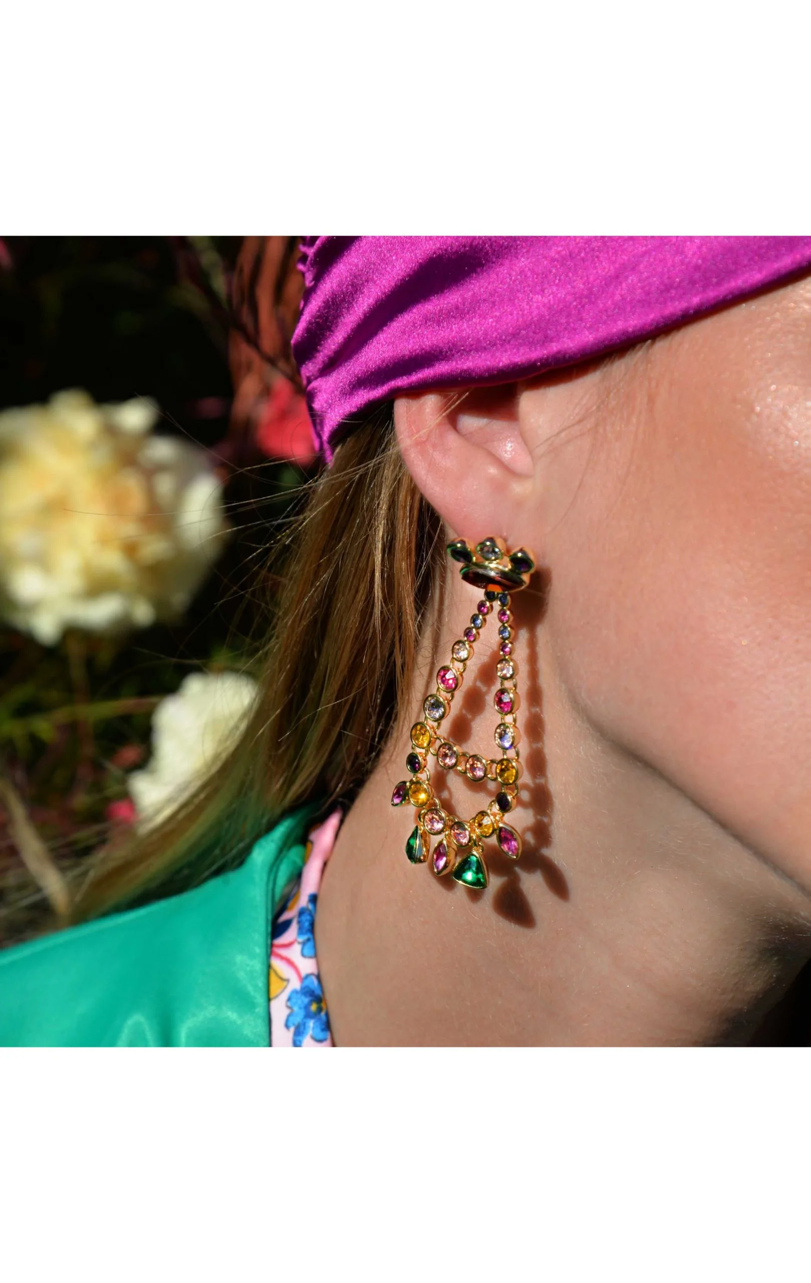 Révélez la diva qui sommeille en vous! Boucles d’oreilles hyper clinquantes, dorées à l’or fin 14 carats, pour un effet dérisoire chic. On retrouve une cascade de strass en ovales multicolores: jaune effet citrine, fuchsia effet rubis, rose effet morganite, violet effet améthyste, avec des formes différentes, à mi-chemin entre diva hollywoodienne et bollywoodienne. Les boucles se terminent par une farandole de pampilles effet goutte et triangulaires. Ce bijou est fait à la main.