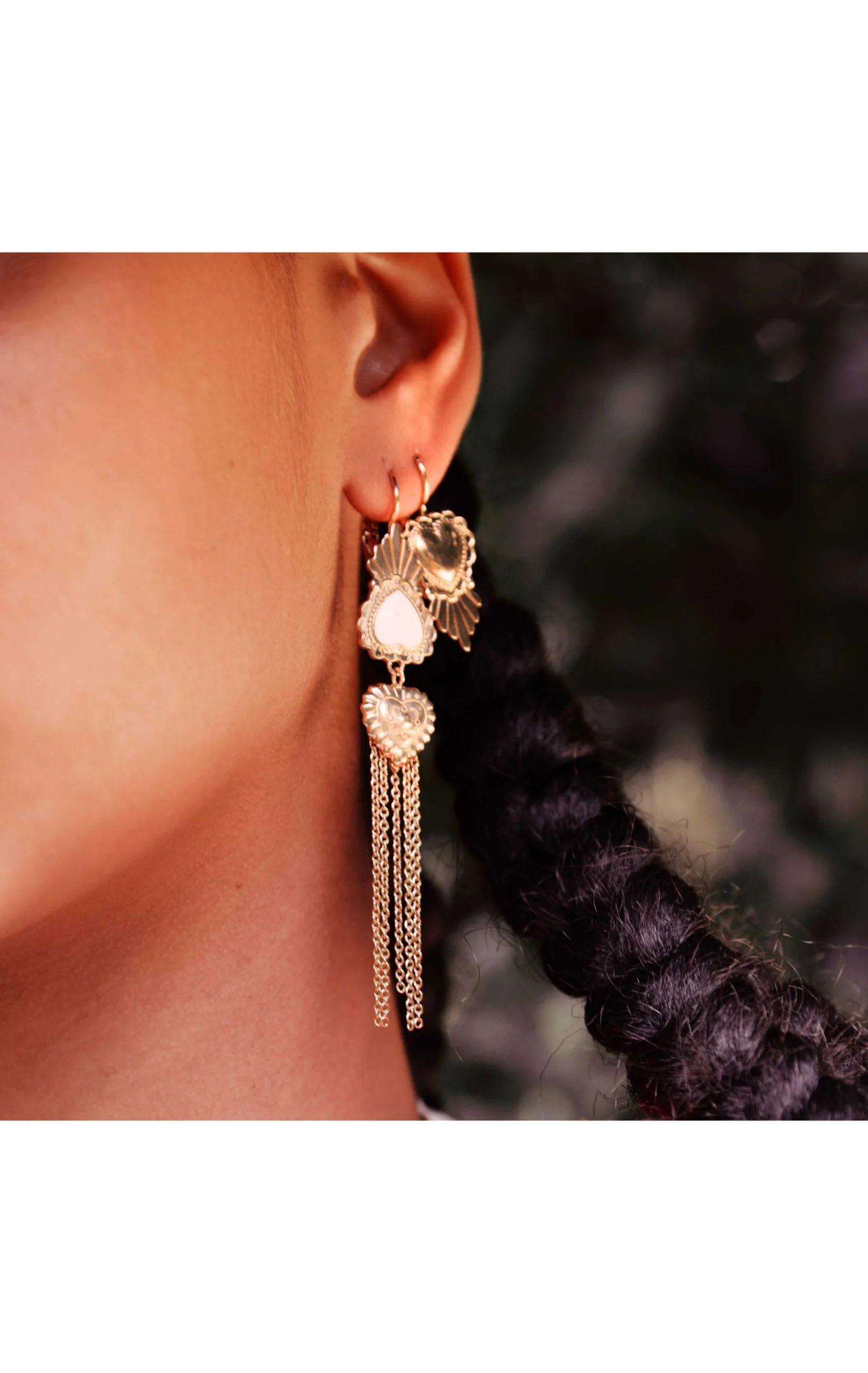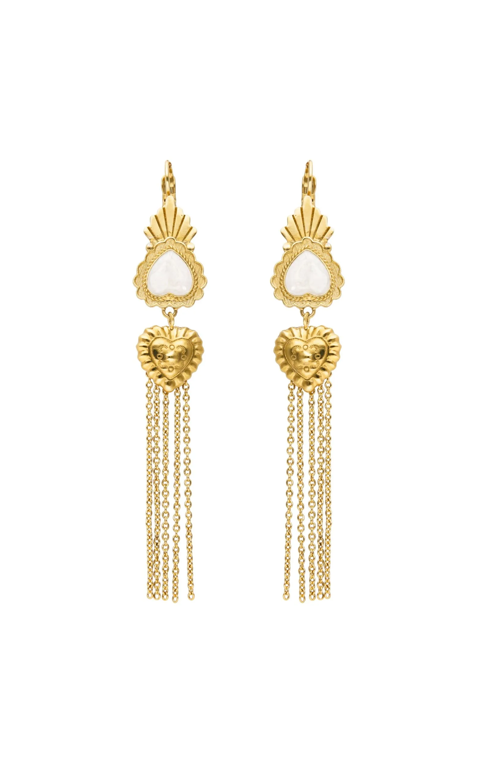 Ravissantes boucles d’oreilles dorées à l’or fin, effet pendant pour oreilles percées, munies d’une fermeture dormeuse. Adoptez cette élégante combinaison de deux cœurs inversés, dont un cœur en résine effet nacré et l’autre paré d’un strass, entourés de godrons et travaillés, avec un pompon de chaînes en cascade qui donne cet effet pendant. Une pièce clin d’œil à notre thème de prédilection très Navajo, inspiré du Mexique que l’on revisite cette saison de manière baroque. Ce bijou est fait à la main.