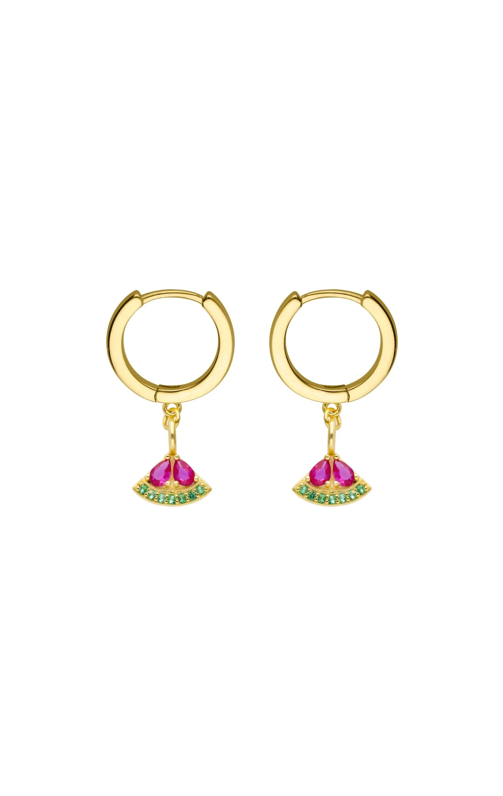 Ravissantes petites créoles dorées à l’or fin 18 carats sur de argent 925 véritable, ce bijou en vermeil vous est garanti sans risque d’allergie. Elles sont ornées de petites pastèques en strass rose fuchsia et vert émeraude.