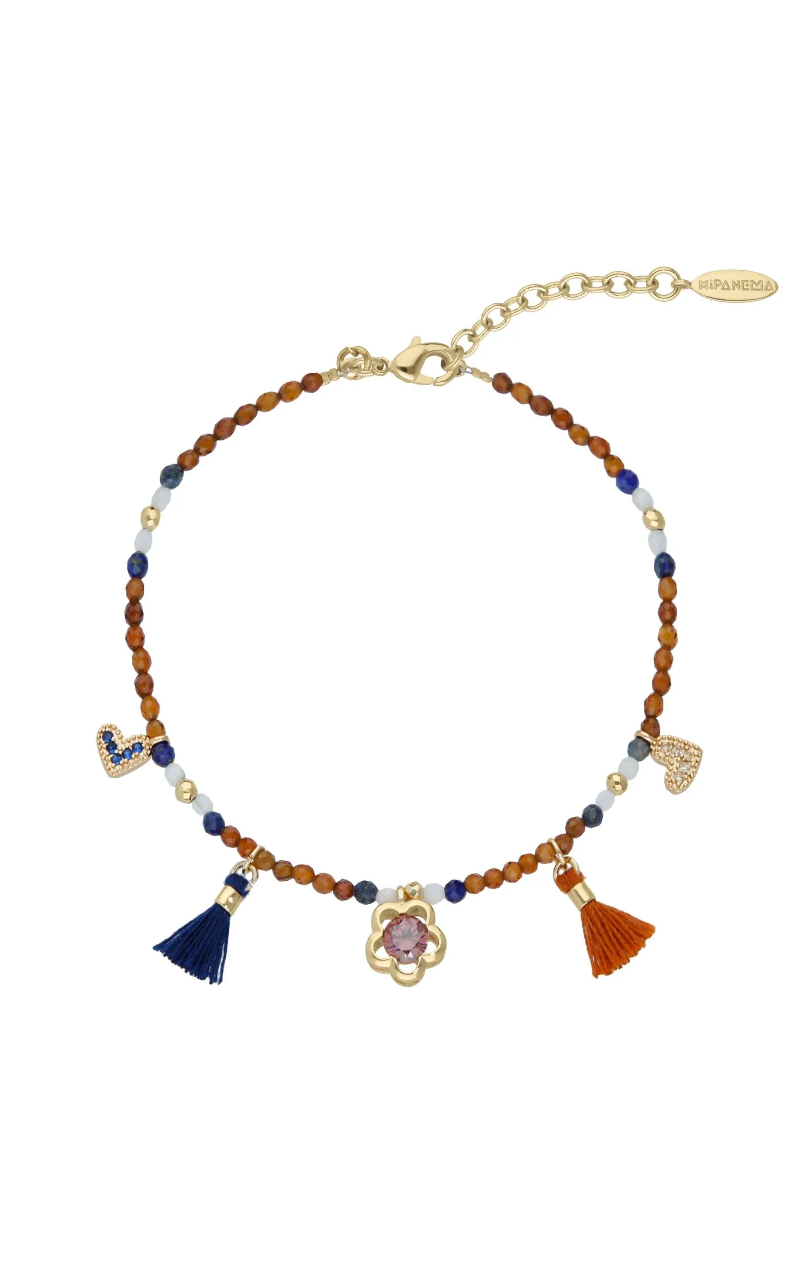 Vous aussi optez pour un style chic et ethnique à la fois! Vous craquerez pour ce petit bracelet doré à l’or fin 14 carats. Il est composé de très petites pierres semi-précieuses ambre, bleu lapis et quartz blanc, et de cinq petites pampilles: deux petits cœurs pavés de strass, l’un de couleur bleu saphire et l’autre de couleur diamant, une petite fleur au centre ornée d’un strass couleur violet améthyste ainsi que deux petits pompons aux couleurs bleu marine et caramel, très automnales. Une petite pièce raffinée dans le pur style d’Hipanema.
