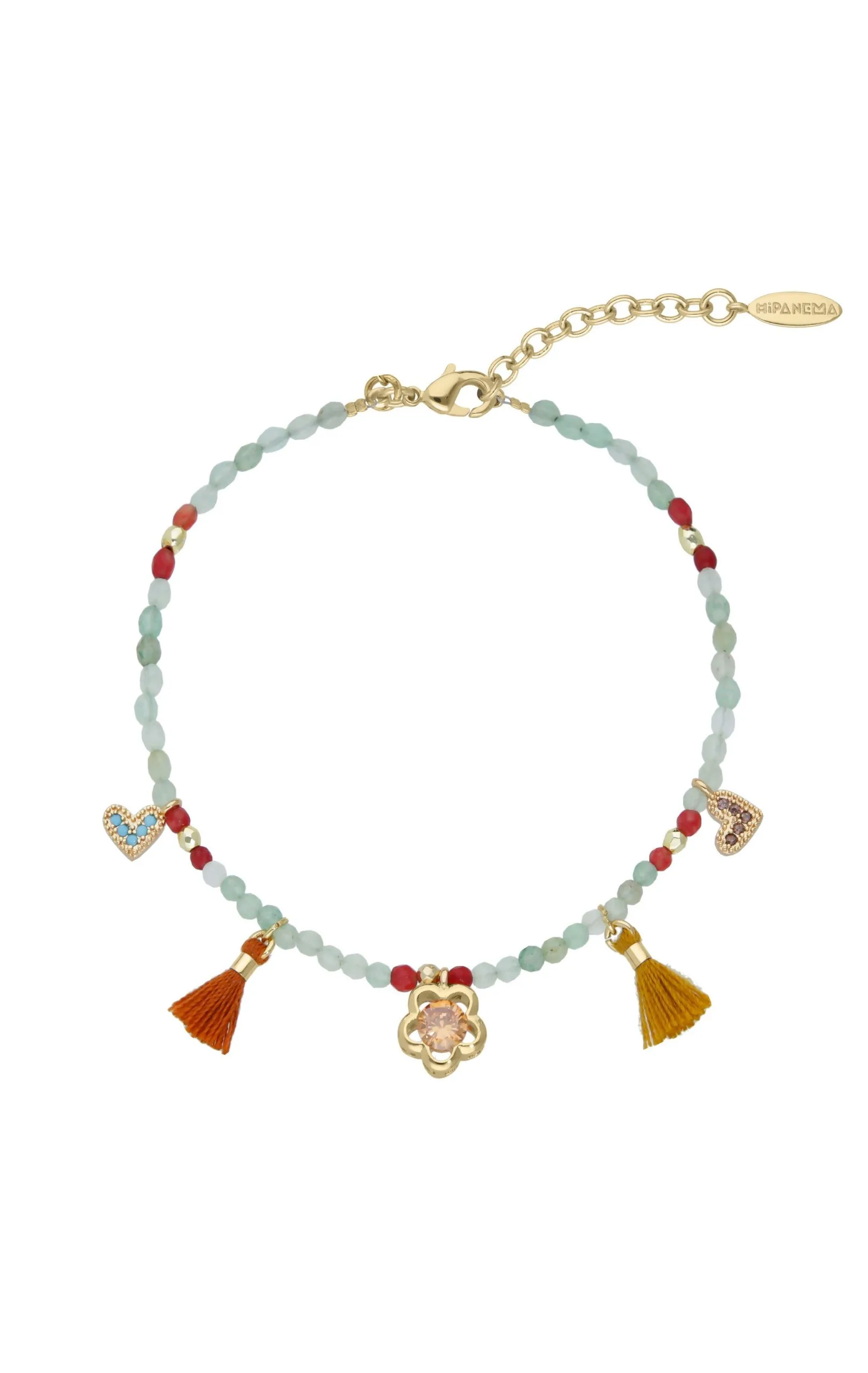 Vous aussi optez pour un style chic et ethnique Ă la fois ! Vous craquerez pour ce petit bracelet dorĂ© Ă l’or fin 14 carats. Il est composĂ© de très petites pierres semi-prĂ©cieuses jade et grenat, et de cinq petites pampilles: deux petits cĹ“urs pavĂ©s de strass, l’un de couleur turquoise et l’autre de couleur pyrite, une petite fleur au centre ornĂ©e d’un strass couleur ambre ainsi que deux petits pompons de couleurs rouille et caramel, très automnales. Une petite pièce raffinĂ©e dans le pur style d’Hipanema.