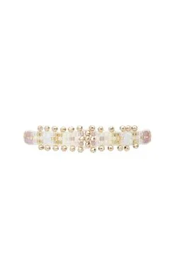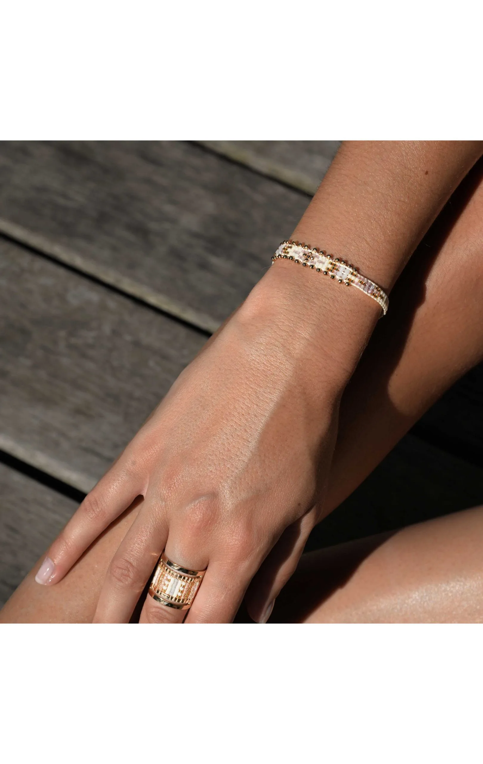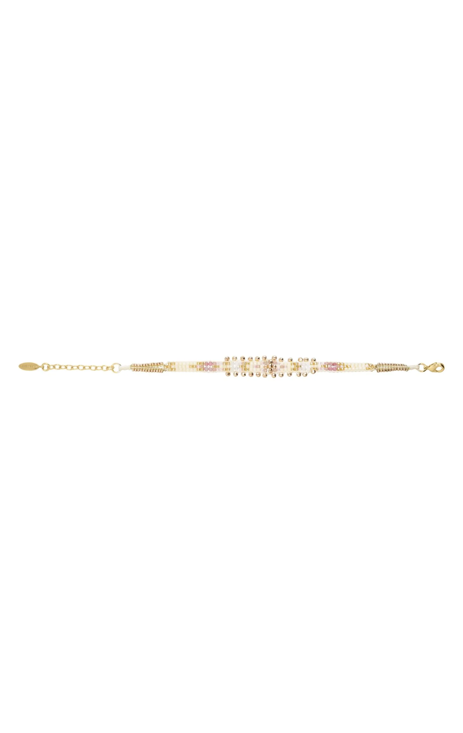 Bracelet tissé, avec un précieux montage de fermoir mousqueton, doré à l’or fin 18 carats. En son centre, on retrouve un motif tissé d’inspiration ethnique où se mêlent des perles Miyuki, dans des déclinaisons de blanc-cassé, de pêche, de rose et de crème, à des perles facettées semi-précieuses en hématite et jade blanc, ainsi que de microscopiques perles en bout de bracelet. Hipanema innove ici avec un tissage très élégant et original pour ce bracelet fait à la main.