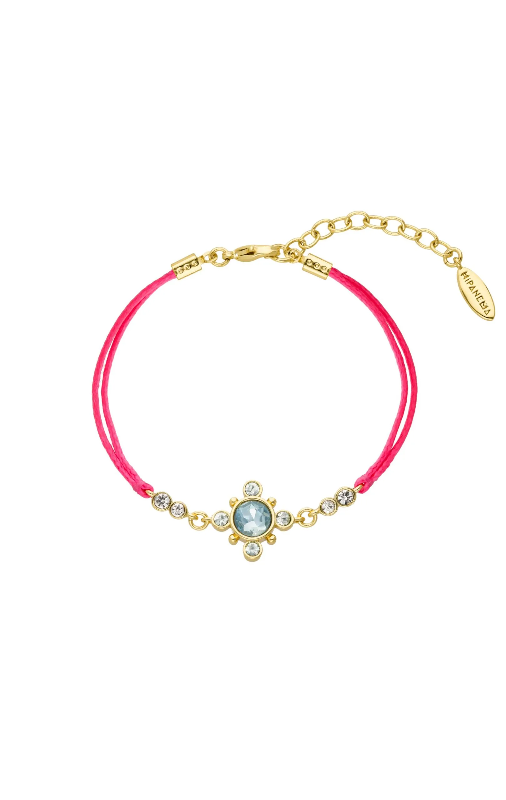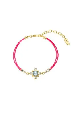 Petit bracelet monté sur un cordon rose fuchsia, fermoir doré à l’or fin 14 carats, avec un cabochon ciel effet topaze aigue-marine entouré de petits strass effet pierre précieuse assortis. Ce bijou, fait à la main, est à porter seul ou en accumulation. Un vrai petit bonbon pour l’été!