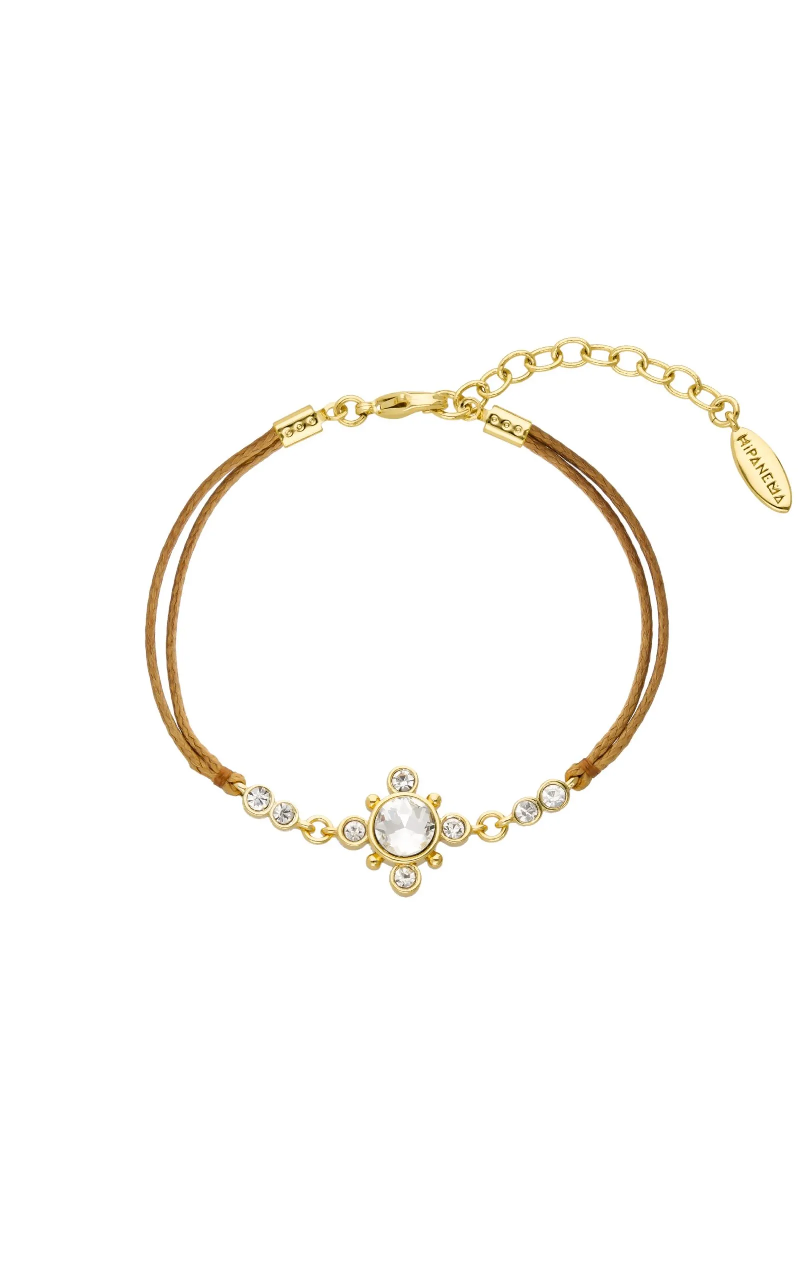 Petit bracelet monté sur un cordon camel, fermoir doré à l’or fin 14 carats, avec un cabochon strass effet diamant entouré de petits strass effet pierre précieuse assortis. Ce bijou, fait à la main, est à porter seul ou en accumulation. Un vrai petit bonbon pour l’été!