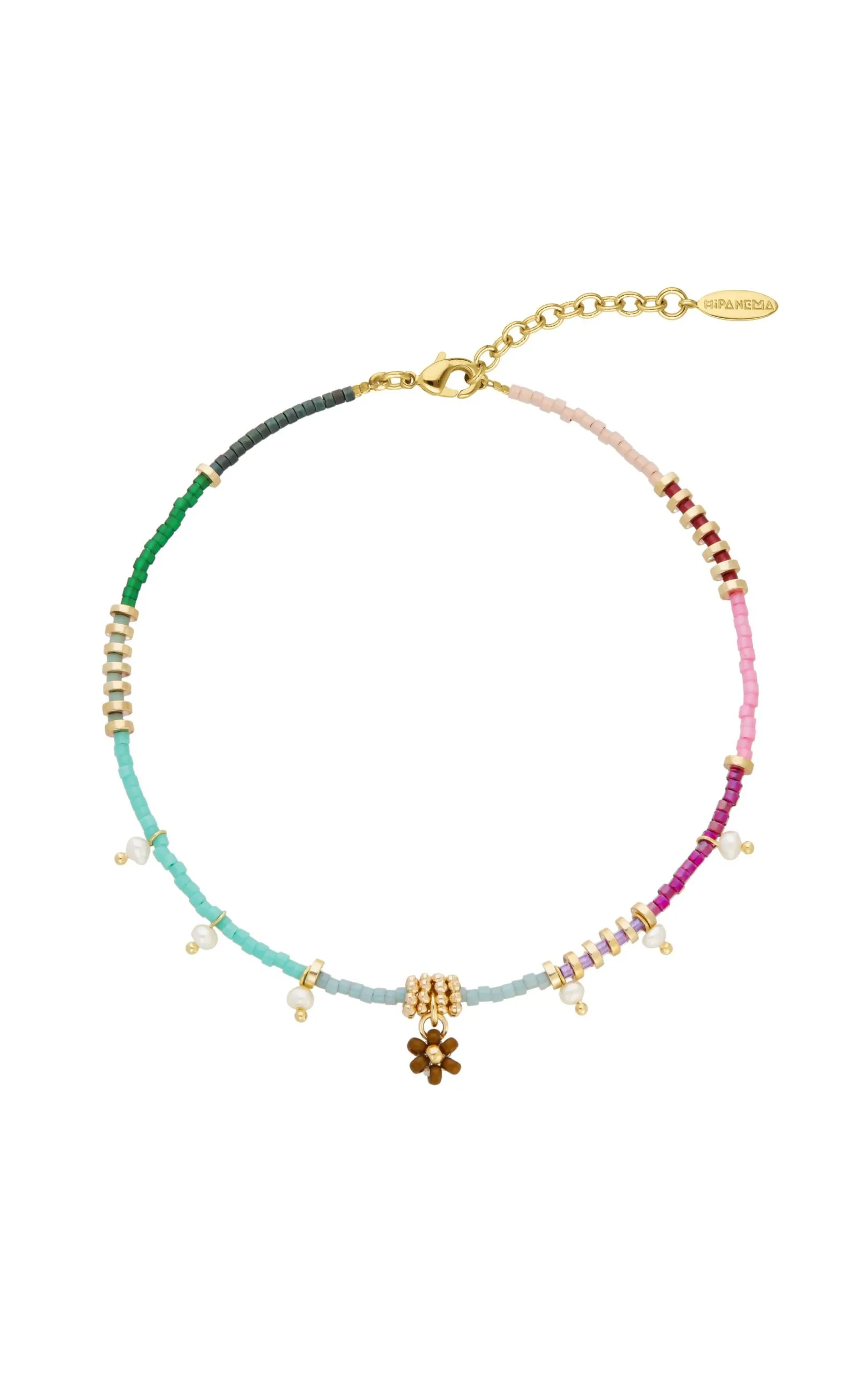 Chaîne de cheville dorée à l’or fin 18 carats, au montage de petites perles de rocaille dans les tons multicolores vert, turquoise, rose, fuchsia et bleu ciel. On adore cette association ravissante de rondelles dorées et de petites perles nacrées, avec en son centre une délicate petite fleur composée de perles. Le bijou des vacances, fait à la main, pour courir pieds nus sur le sable chaud.