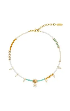 Chaîne de cheville dorée à l’or fin 18 carats, au montage de petites perles de rocaille dans les tons blancs, où l’on retrouve des tons turquoise, blanc, crème et ocre. On adore cette association ravissante de rondelles dorées et de petites perles nacrées, avec en son centre une délicate petite fleur composée de perles. Le bijou des vacances, fait à la main, pour courir pieds nus sur le sable chaud.