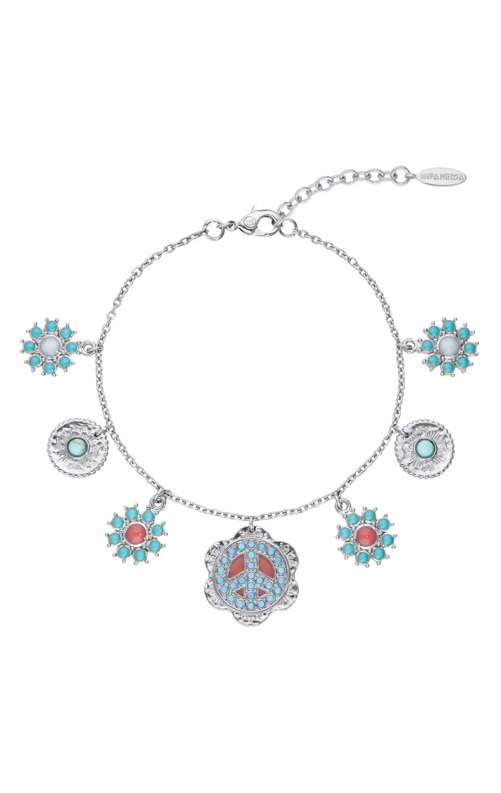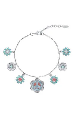 Voici la pièce rétro chic qu’il vous faut pour l’hiver! Ce petit bracelet argenté est décoré de petites breloques en forme de fleurs émaillées dans les tons beige et grenat, ainsi que d’un symbole Peace and love en son centre de couleur turquoise. On adore le style Navajo, revisité de manière baroque, qui rend ce bracelet atypique et féminin.