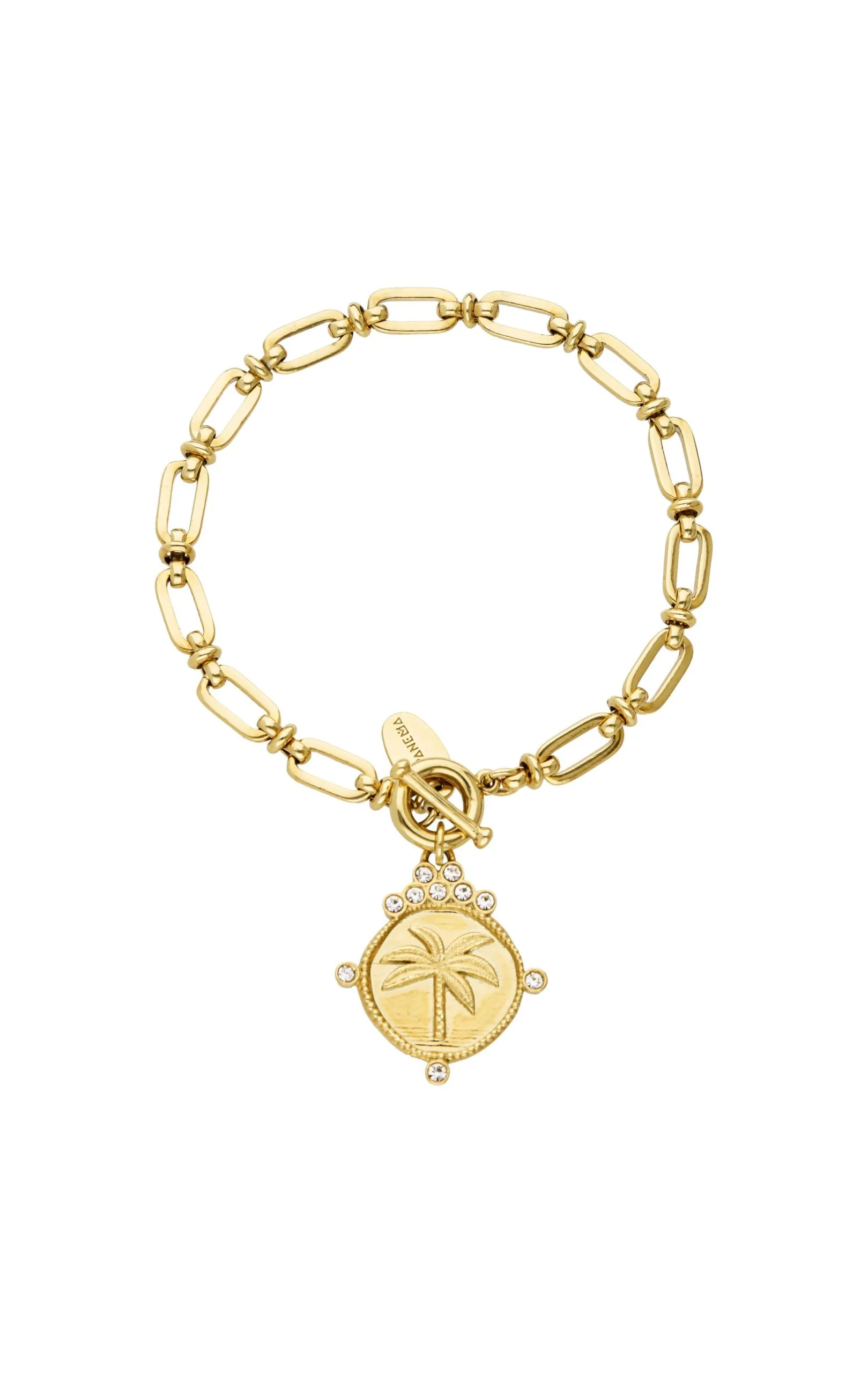 Osez la grosse maille avec notre bracelet Delsol! Comme une invitation au soleil, à la douce folie et l’énergie des années 1990, on adopte ce bracelet chaîne imposant façon gourmette. Son fermoir anneau est orné d’une médaille ouvragée avec un palmier au centre, surplombé d’une petite couronne strassée. Cette médaille est entourée de strass effet diamant pour lui apporter de la lumière. On adore ce côté classique, cette chaîne au joli volume, avec une vibe très summer style tout en panache. Ce bijou est fait à la main.