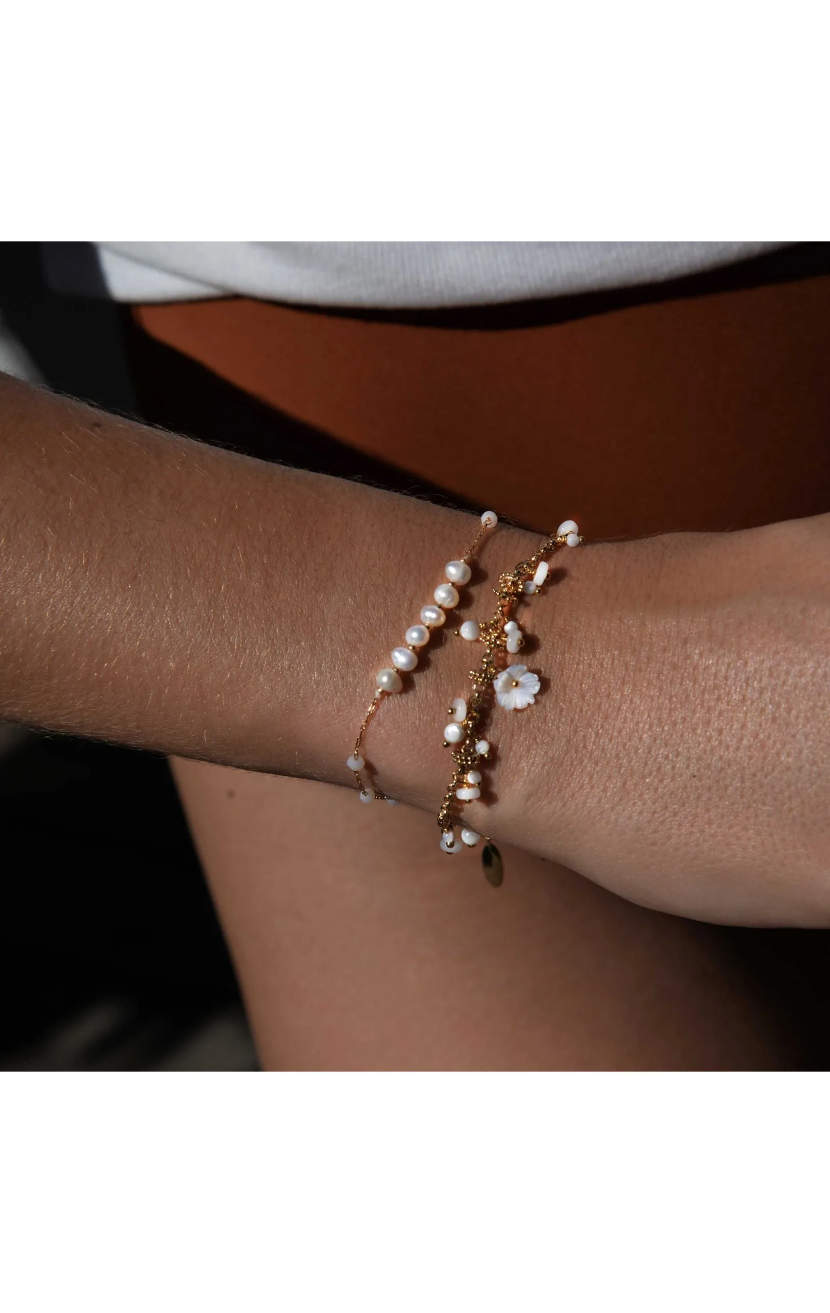 Bracelet doré à l’or fin 14 carats sur chaîne forçat un peu cossue, rehaussée de petites perles nacrées. On aime l’accumulation des petits anneaux dorés ouvragés en son centre, associée à une ravissante fleur nacrée qui achève de donner un look printanier à ce bijou fait main, indispensable pour l’été.