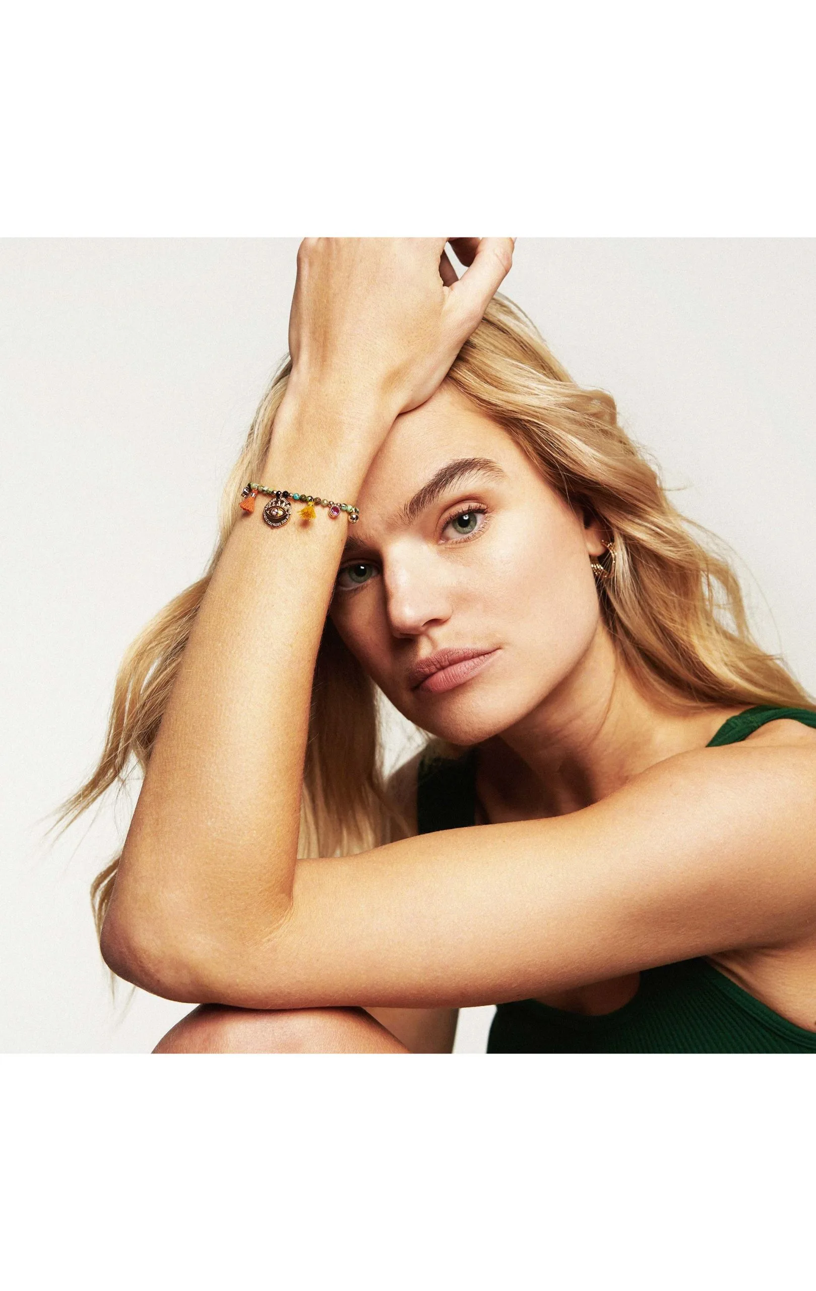Cet hiver, vous aussi, craquez pour cette pièce précieuse et colorée à l’esprit résolument bohème! Ce petit bracelet doré à l’or fin 14 carats est entièrement constitué de pierres semi-précieuses dans les tons turquoise et noir. Il est décoré de petites pampilles multicolores avec en son centre une médaille représentant un œil intégralement pavée de strass effet diamant et d’un strass central rose. Il est également orné de deux petits pompons de couleur rouille et jaune, de deux petits grelots ainsi que de deux gouttes de couleur améthyste et rubis.