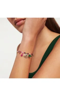 Cet hiver, vous aussi, craquez pour cette pièce précieuse et colorée à l’esprit résolument bohème! Ce petit bracelet doré à l’or fin 14 carats est entièrement constitué de pierres semi-précieuses dans les tons blanc, violet améthyste, vert émeraude et ambre. Il est décoré de petites pampilles multicolores avec en son centre une médaille représentant un œil intégralement pavée de strass effet diamant et d’un strass central rouge effet rubis. Il est également orné de deux petits pompons de couleur rose indien et vert, de deux petits grelots ainsi que de deux gouttes de couleur orange et vert.
