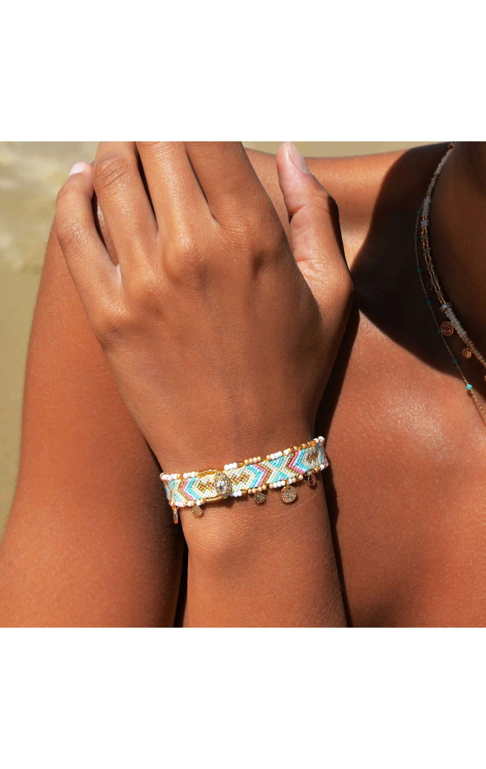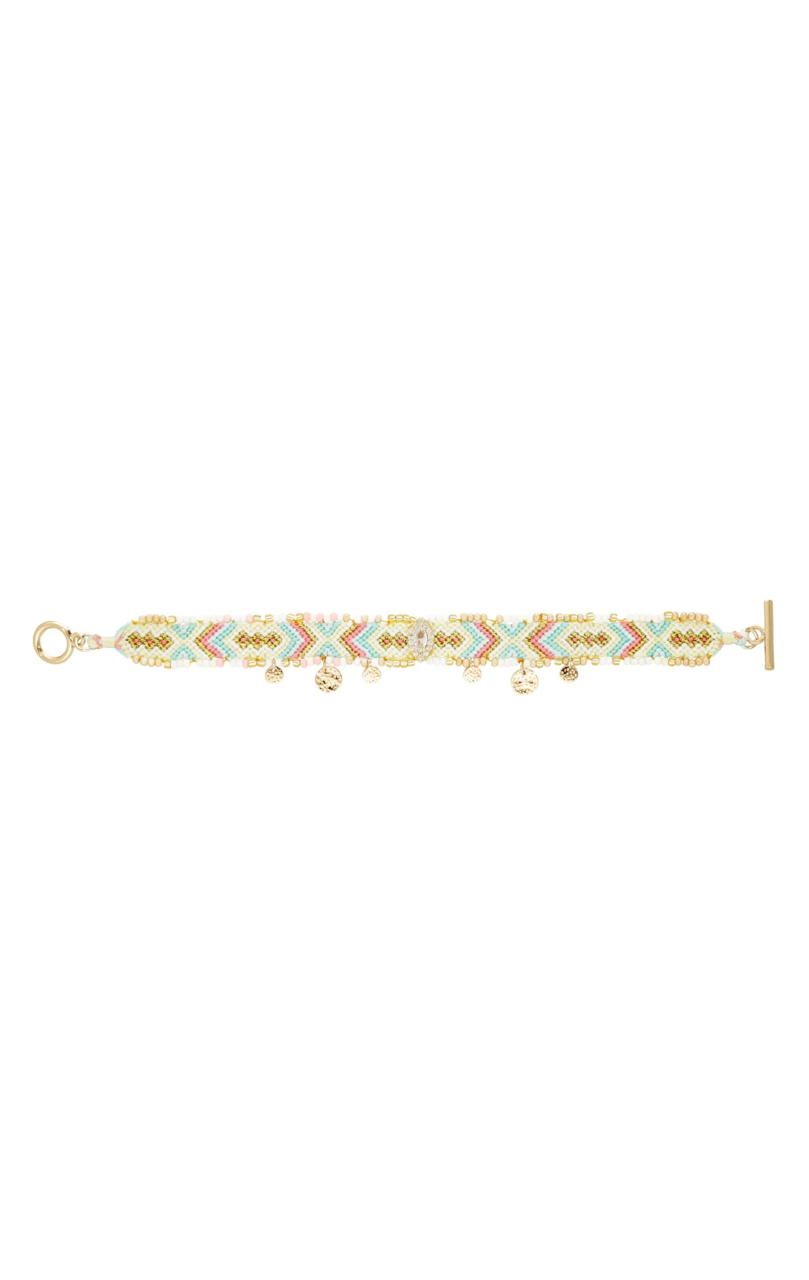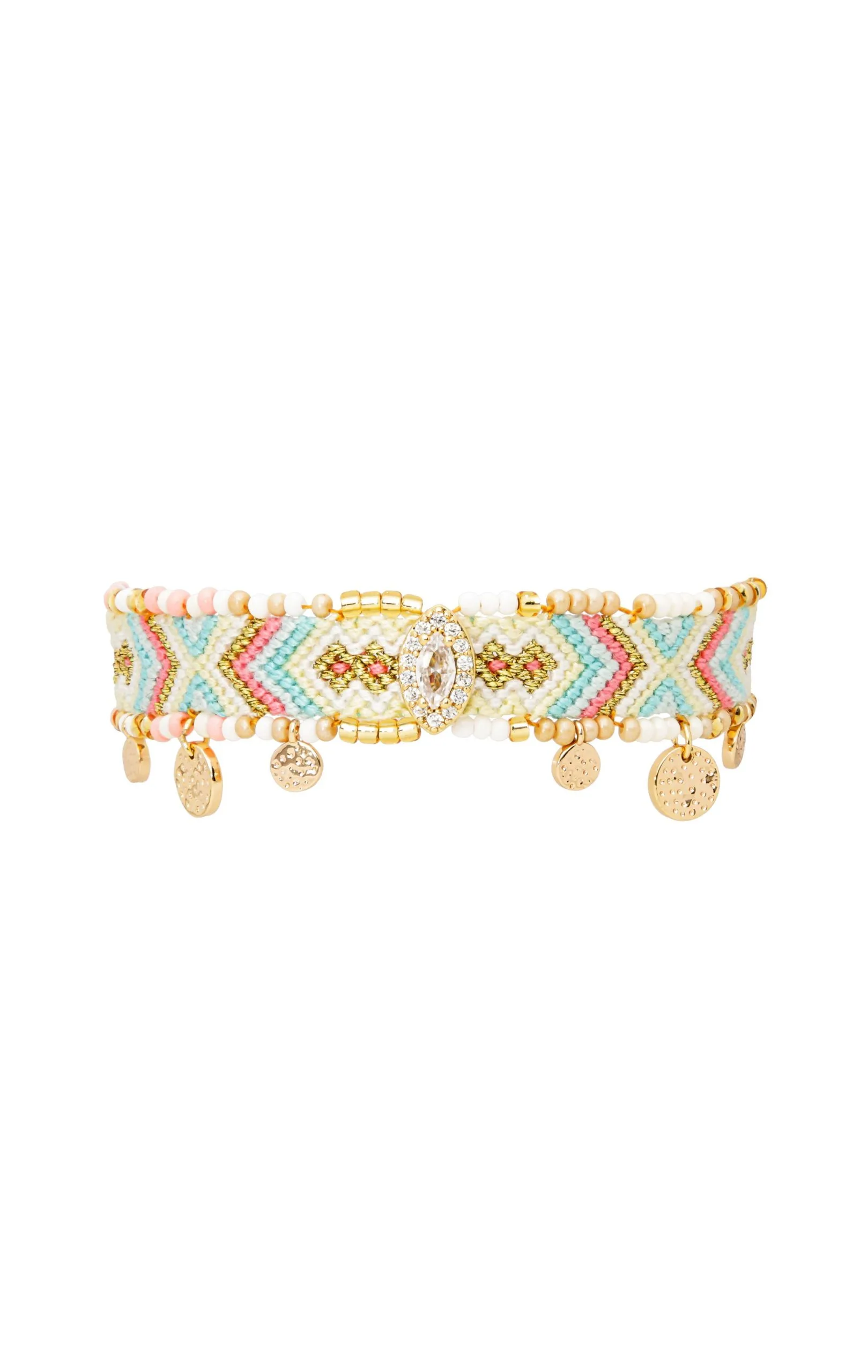 Des couleurs, de la joie, un tissage hypnotique, pas de doute, c’est un bracelet Hipanema! La griffe revisite ses pièces iconiques avec ce bracelet tissé dans des tonalités de pêche, crème, turquoise, blanc, baby rose, aux perles colorées cousues de chaque côté. Pour la touche sophistiquée, un cabochon précieux s’invite au milieu avec une pierre effet diamant. Six petites pampilles dorées de tailles différentes achèvent de faire de ce bracelet fait à la main, le hit de votre été.
