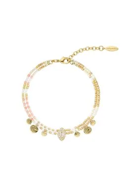 Coup de cœur garanti pour ce petit bracelet haut en couleurs! Il reprend tous les codes ethniques chics chers à Hipanema, avec son tissage en perles réalisé à la main, jouant sur un montage de perles en verre colorées, dans des tonalités de pêche, crème, baby rose, camel. Bracelet porte-bonheur, il se mue en objet précieux avec son cabochon central doré travaillé, orné d’une pierre cristal effet diamant, entourée de pampilles sequins dorés. À porter seul ou en accumulation. Pour les petites et les grandes occasions.