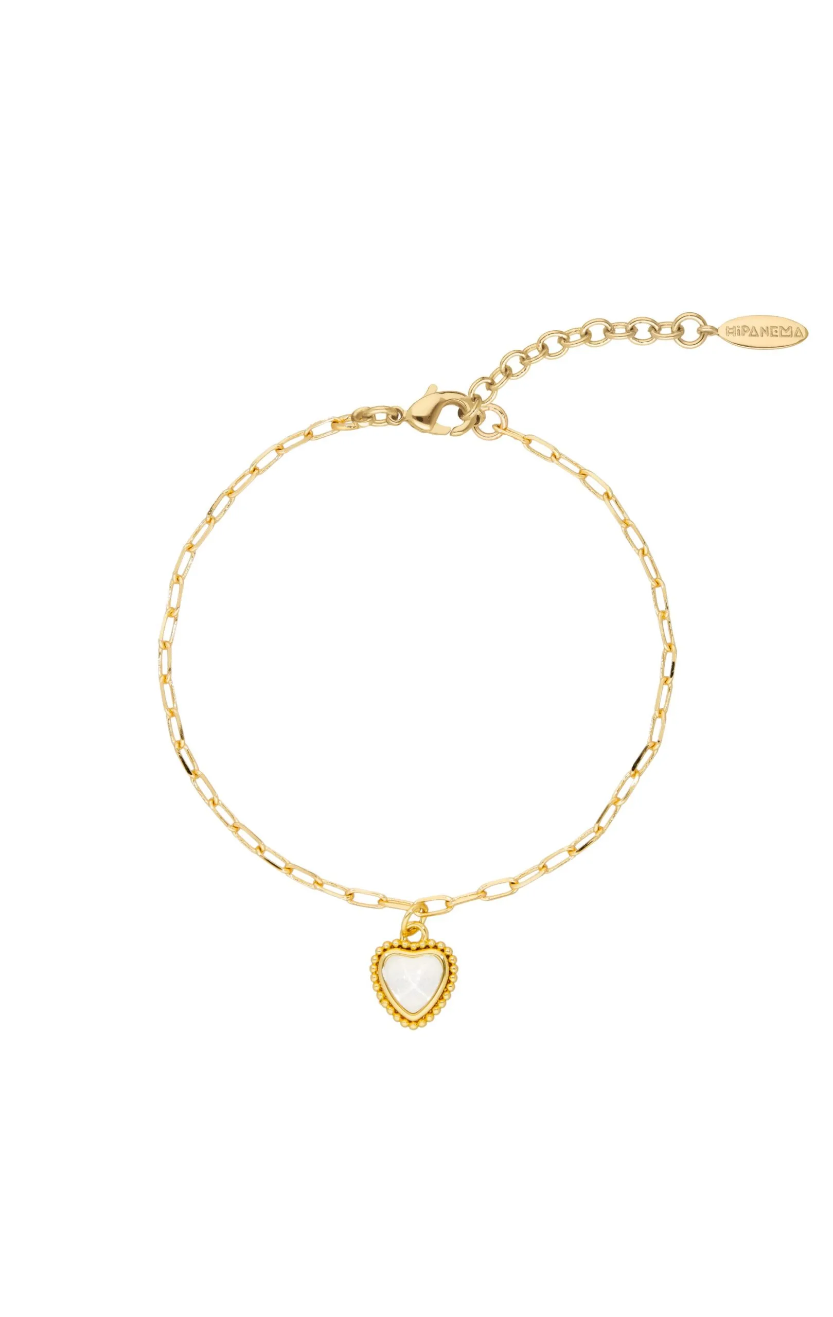 Bracelet monté sur une chaîne dorée à l’or fin 18 carats, orné d’un ravissant petit cœur ouvragé, blanc transparent nacré. La pièce indispensable pour un look raffiné et romantique, que l’on porte seule ou en accumulation. À offrir sans modération à l’être aimé pour la Saint Valentin.