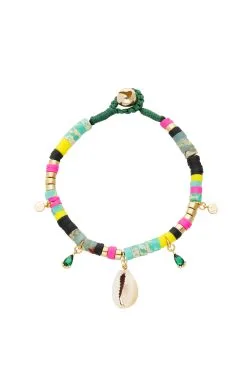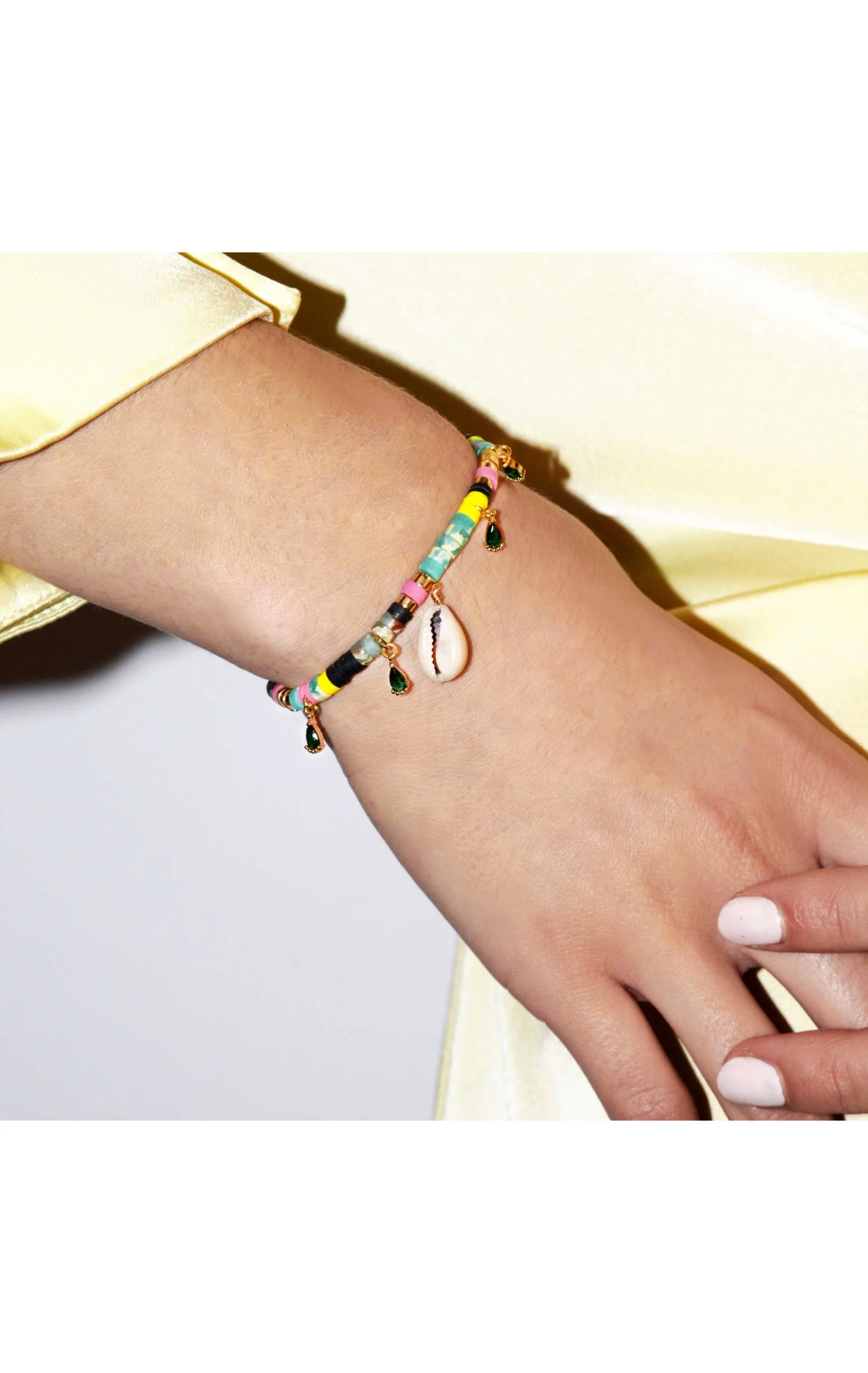 Adorable petit bracelet estival composé de perles semi-précieuses, de sequins en rondelles dorés à l’or fin 18 carats, de rondelles silicones multicolores, dans des tons noir, vert d’eau, jaune fluo, rose fluo et doré. On retrouve en son centre un coquillage cauri ainsi que des pampilles forme goutte vertes effet émeraude. Coup de cœur pour ce bijou fait à la main avec amour, au petit grelot fermoir mutin.