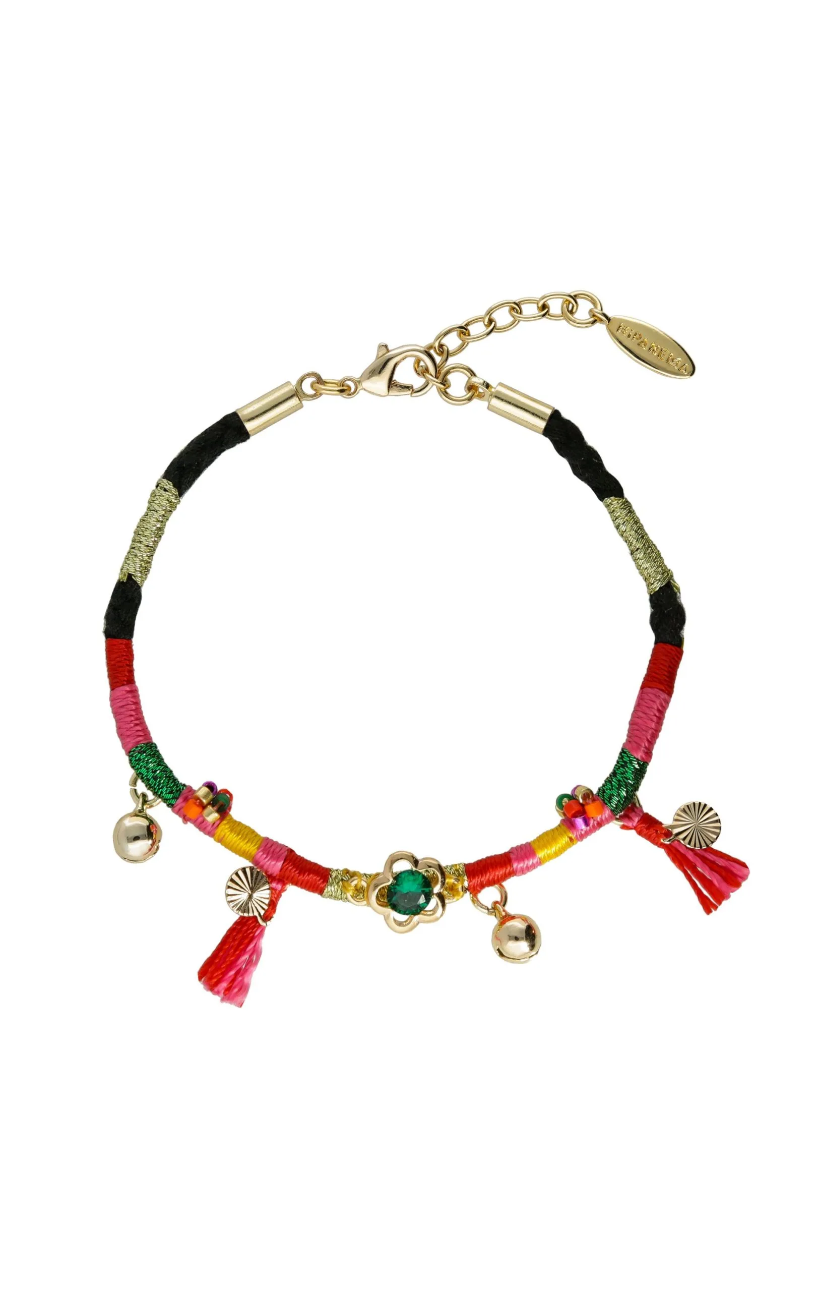 Petit bracelet doré à l’or fin 14 carats entièrement constitué de fils enroulés dans les tons noir, doré, rose fuchsia, rouge et vert. Il est orné de petits pompons de couleur et de grelots, ainsi que d’une marguerite en son centre qui est décorée d’un strass de couleur vert émeraude. Vous raffolerez de son look brésilien revisité à la façon d’Hipanema!