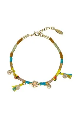 Petit bracelet doré à l’or fin 14 carats entièrement constitué de fils enroulés dans les tons caramel, bleu turquoise, jaune fluo et bronze. Il est orné de petits pompons de couleur et de grelots, ainsi que d’une marguerite en son centre qui est décorée d’un strass de couleur ambre. Vous raffolerez de son look brésilien revisité à la façon d’Hipanema!