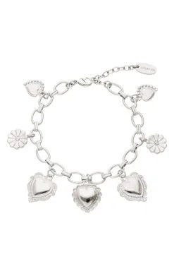 Bracelet argenté sur sur une chaîne au maillon rond jaseron, avec des pampilles effet breloques. On adore cet esprit Navajo, Nouveau-Mexique, fil rouge de notre collection. En son centre, trois cœurs argentés travaillés de façon ex-voto, sont entourés de petits cœurs en breloques, ornés de petits strass effet diamant. Ce bijou est fait à la main.