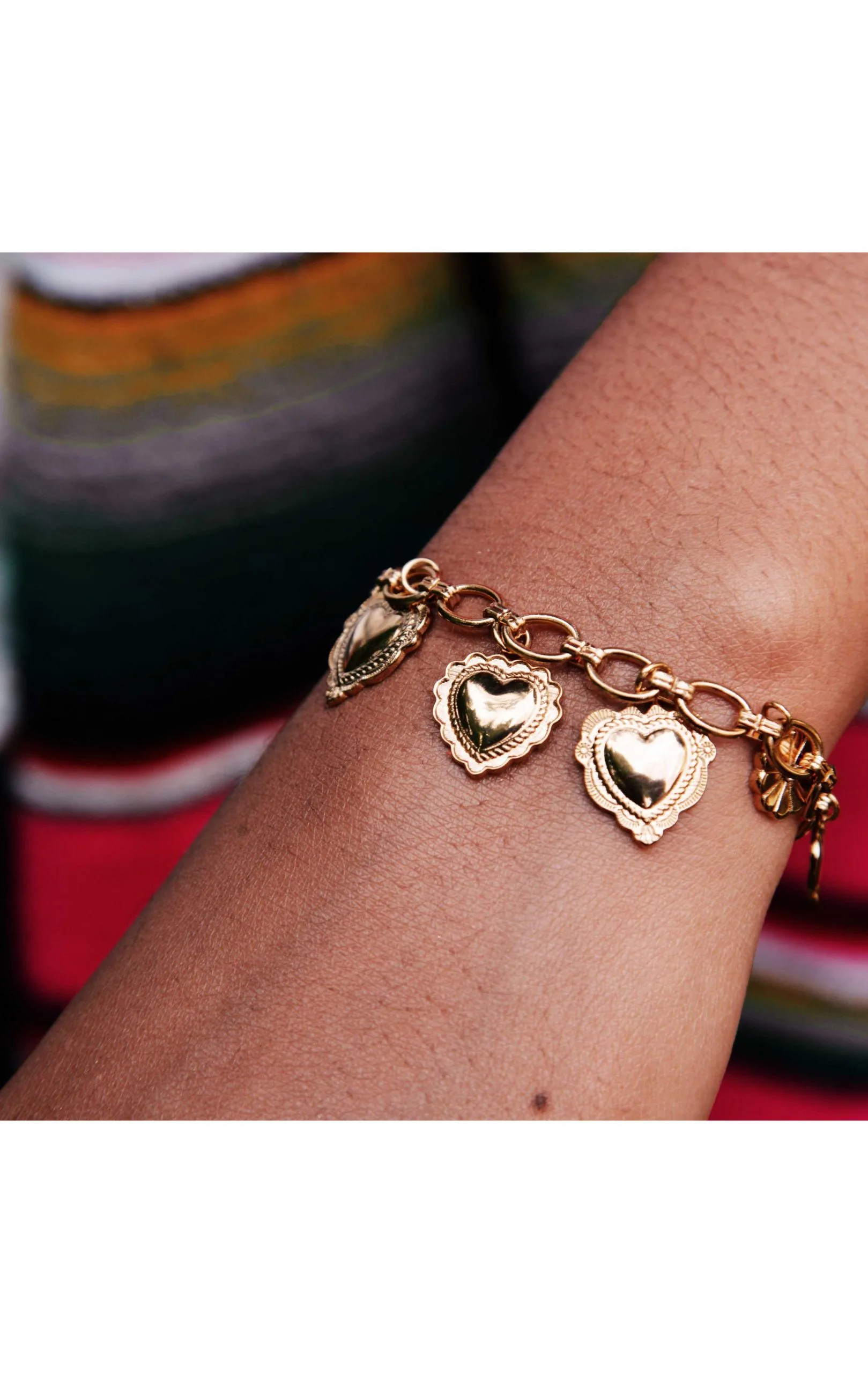 Bracelet doré à l’or fin sur sur une chaîne au maillon rond jaseron, avec des pampilles effet breloques. On adore cet esprit Navajo, Nouveau-Mexique, fil rouge de notre collection. En son centre, trois cœurs dorés travaillés de façon ex-voto, sont entourés de petits cœurs en breloques, ornés de petits strass effet diamant. Ce bijou est fait à la main.