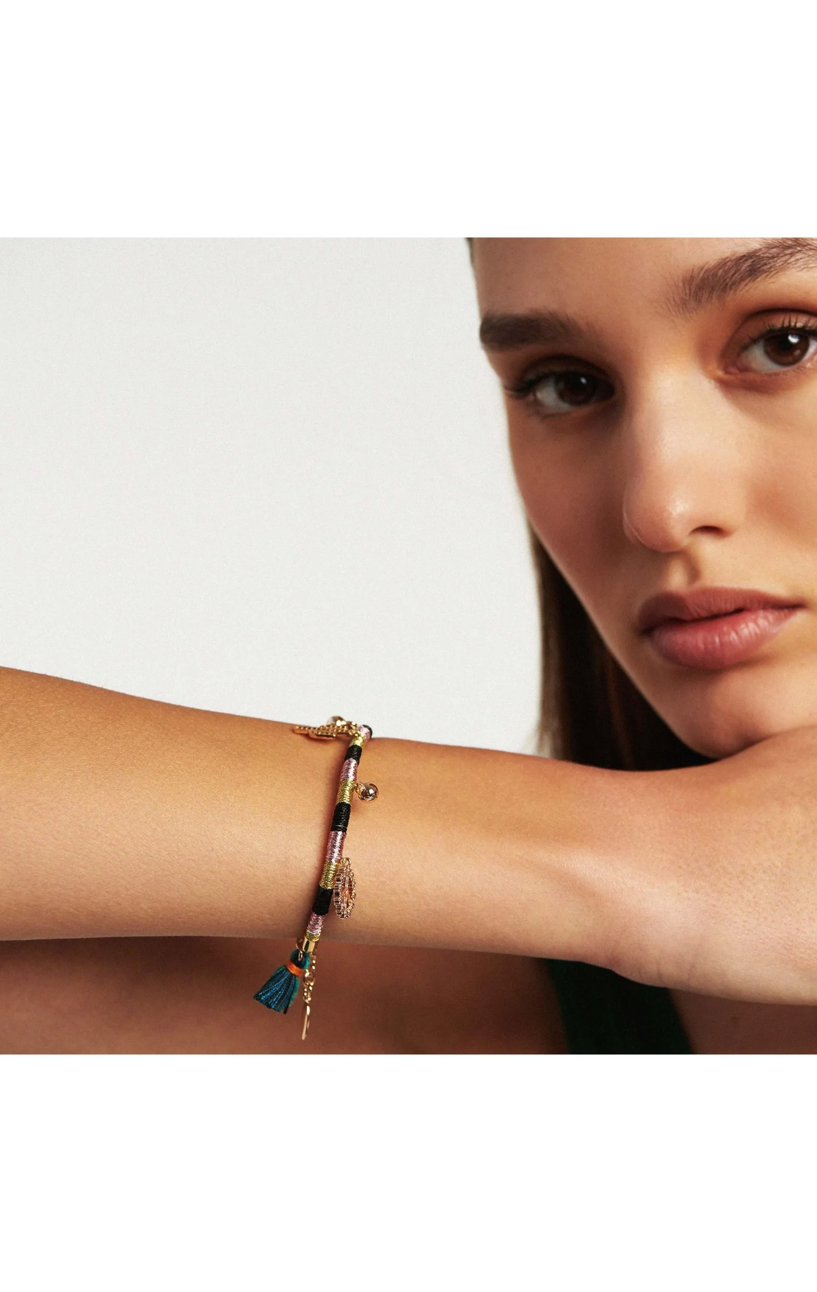 Cet hiver vous allez craquer pour ce petit bracelet brésilien revisité à la façon d’Hipanema! Il est composé de fils enroulés bicolores dans les tons doré, rose et noir, et décoré de cinq petites pampilles: un petit peace and love pavé de strass effet diamant et un cactus pavés de strass noir fumé, une petite tête de mort aux yeux décorés de strass de couleur noir onyx et deux petits grelots. Une pièce ravissante à porter en accumulation avec plain d’autres.