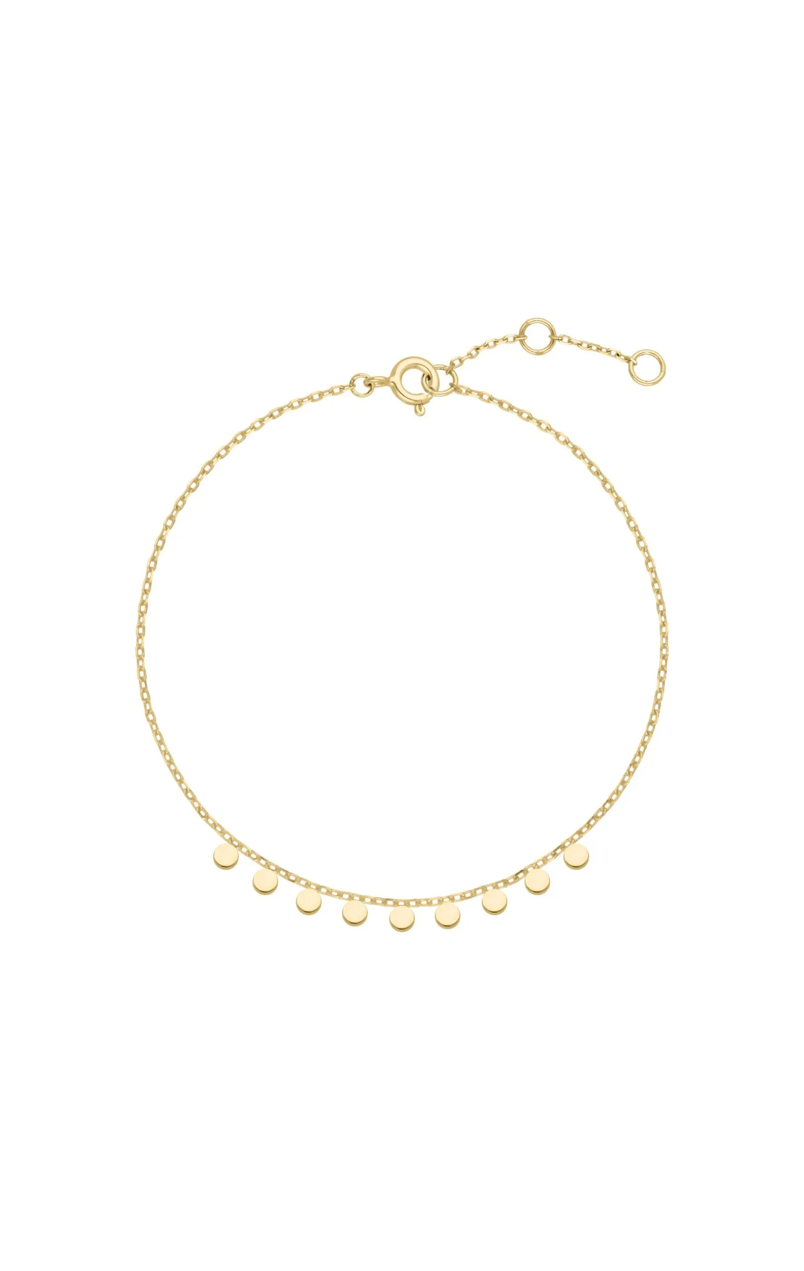 Bracelet composé de neuf sequins en micro-piécettes, soudés sur une chaîne forçat. Mention spéciale pour ce ravissant bracelet discret, aussi joli porté seul qu’en accumulation. Doré à l’or fin 18 carats sur de argent 925 véritable, ce bijou en vermeil vous est garanti sans risque d’allergie.