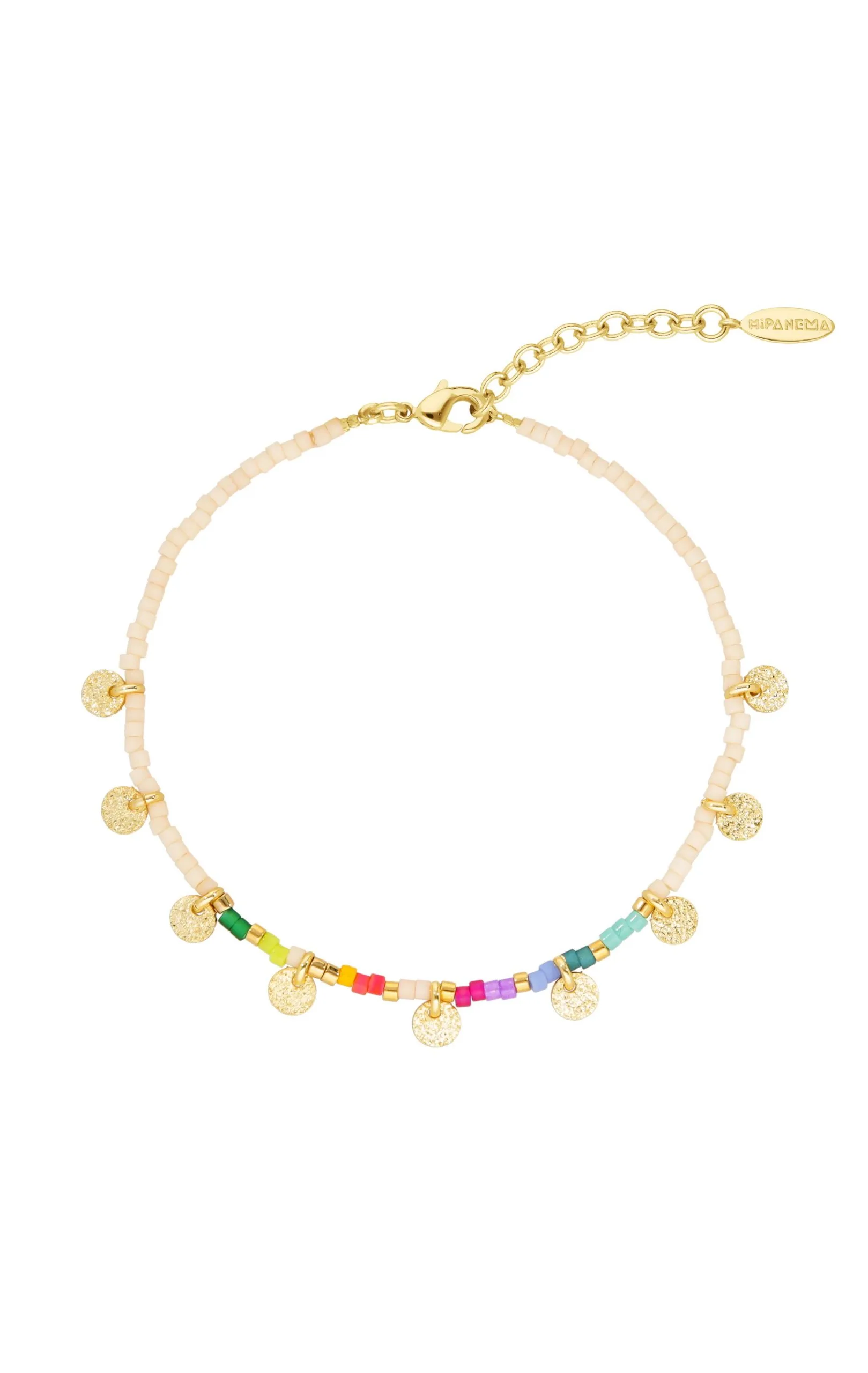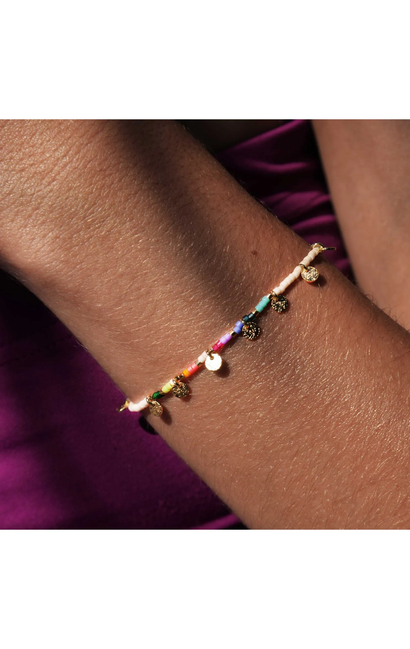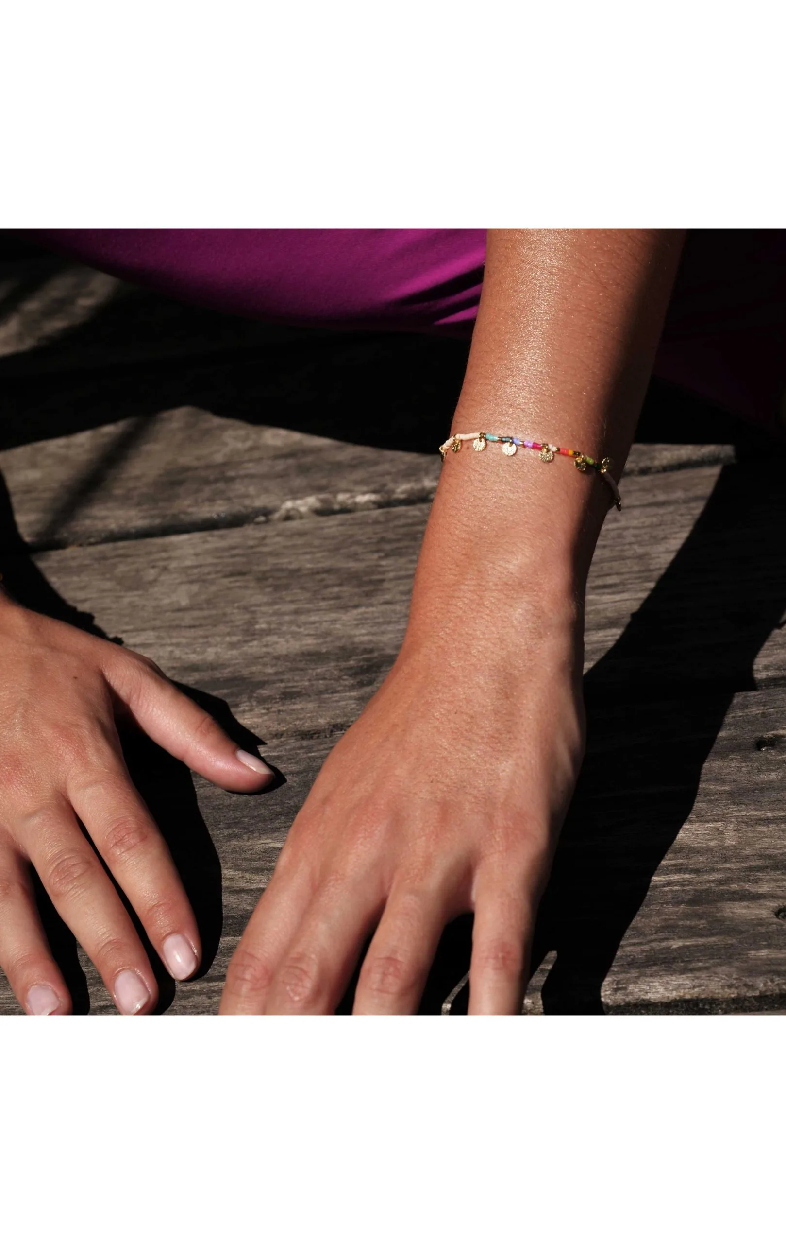 Ravissant petit bracelet doré à l’or fin 14 carats, en perles de rocaille Miyuki multicolores, où s’intercale du bleu, du vert d’eau, du violet, du rose, de l’orangé, du vert clair et vert effet malachite, du doré. Pour apporter une touche de lumière à l’ensemble, ainsi qu’un petit twist d’artisanat du bout du monde, on adore cette accumulation de sequins dorés. Le bijou, fait à la main, parfait à porter seul ou en accumulation.