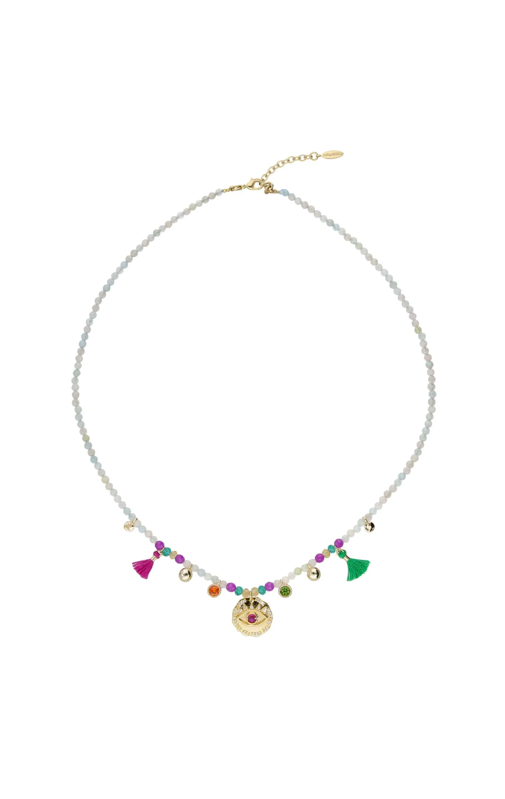 Cet hiver, vous aussi, craquez pour cette pièce précieuse et colorée à l’esprit totalement bohème! Ce collier ras de cou doré à l’or fin 14 carats est entièrement constitué de pierres semi-précieuses dans les tons blanc, violet améthyste, vert émeraude et ambre. Il est décoré de petites pampilles multicolores avec en son centre une médaille représentant un œil intégralement pavée de strass effet diamant et d’un strass central rouge effet rubis. Il est également orné de deux petits pompons aux couleurs rose indien et vert, de deux petits grelots ainsi que de deux gouttes aux couleurs orange et vert.