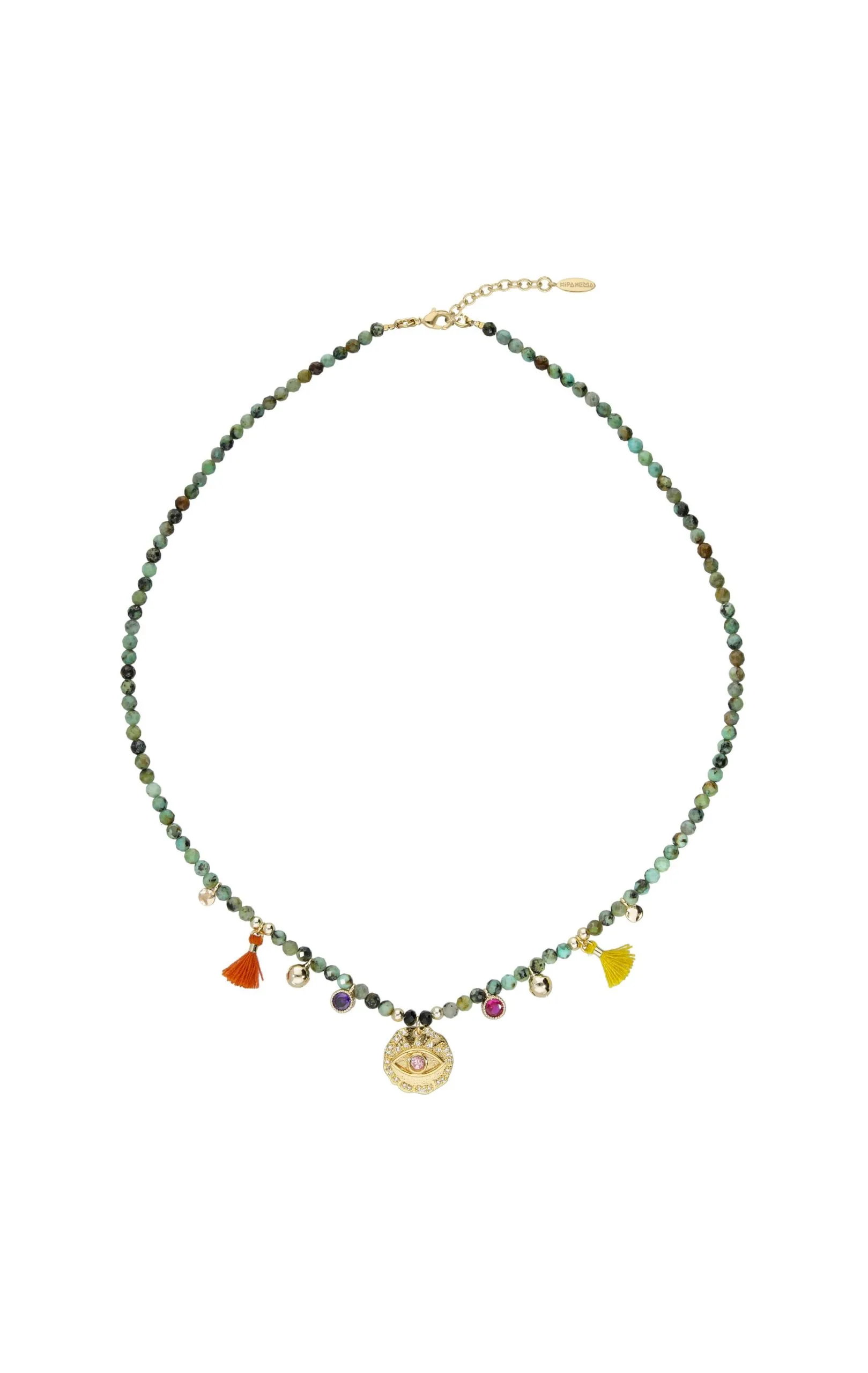 Cet hiver, vous aussi, craquez pour cette pièce précieuse et colorée à l’esprit très bohème! Ce collier ras de cou doré à l’or fin 14 carats est entièrement constitué de pierres semi-précieuses dans les tons turquoise et noir. Il est décoré de petites pampilles multicolores avec en son centre une médaille représentant un œil intégralement pavée de strass effet diamant et d’un strass central rose. Il est également orné de deux petits pompons aux couleurs rouille et jaune, de deux petits grelots ainsi que de deux gouttes de couleur améthyste et rubis.