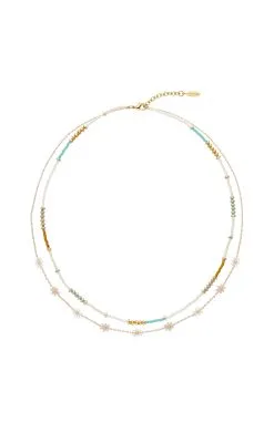 Voilà l’été avec ce collier double-chaîne ensoleillé: le premier lien est composé de perles de verre dans des tons blanc, turquoise, ocre, effet nacré perle. Le deuxième lien est une chaîne forçat dorée à l’or fin 18 carats, sur laquelle sont brodées des marguerites effet nacré. Un bijou fait à la main, parfait pour les beaux jours.