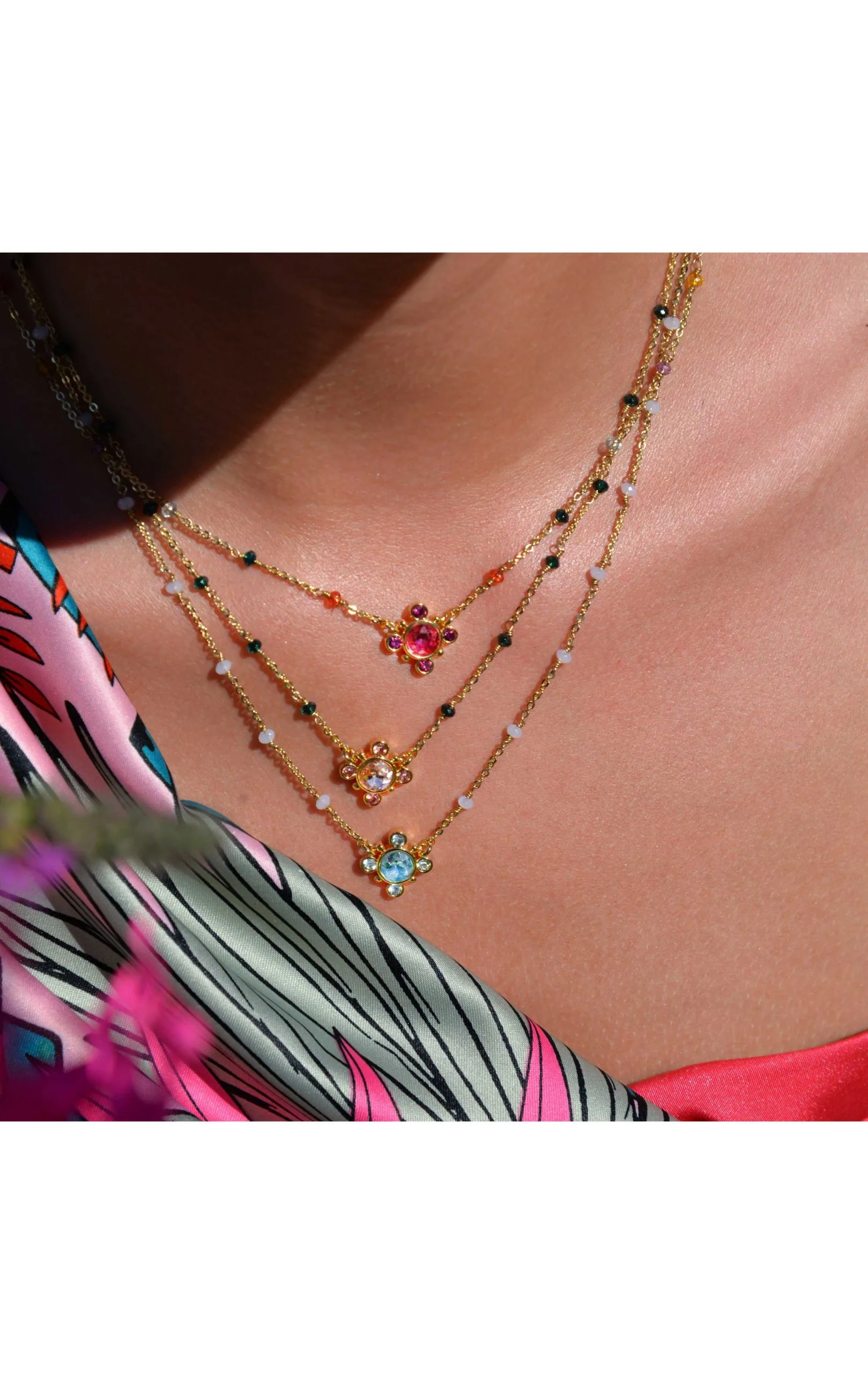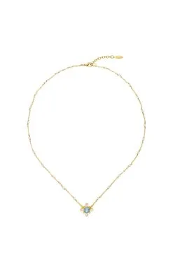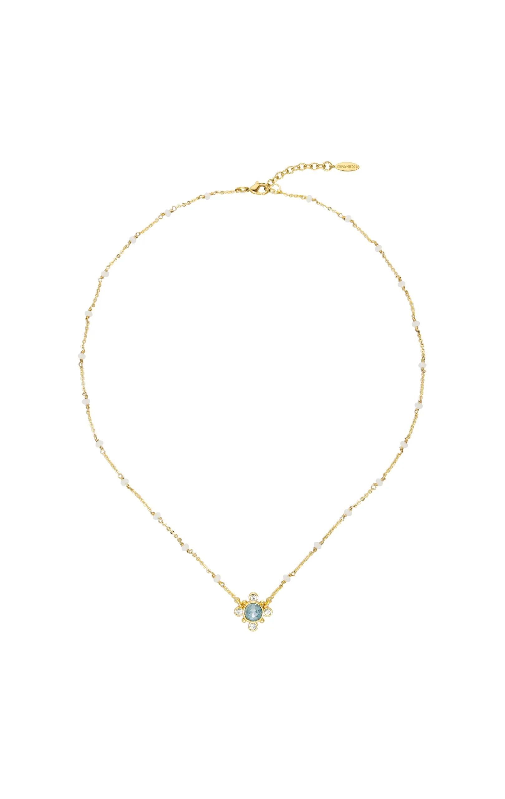 Ravissant collier monté sur une chaîne chapelet en laiton doré à l’or fin 14 carats, composée de perles de verre facettées blanches laiteuses. On adore l’effet petite croix revisitée de ce charm pampille au centre, composé d’un gros strass entouré de quatre petits strass assortis bleu ciel effet aigue-marine. C’est l’élégant petit bijou d’été, fait à la main, à adopter sans hésiter, avec la touche Hipanema, entre originalité et raffinement.